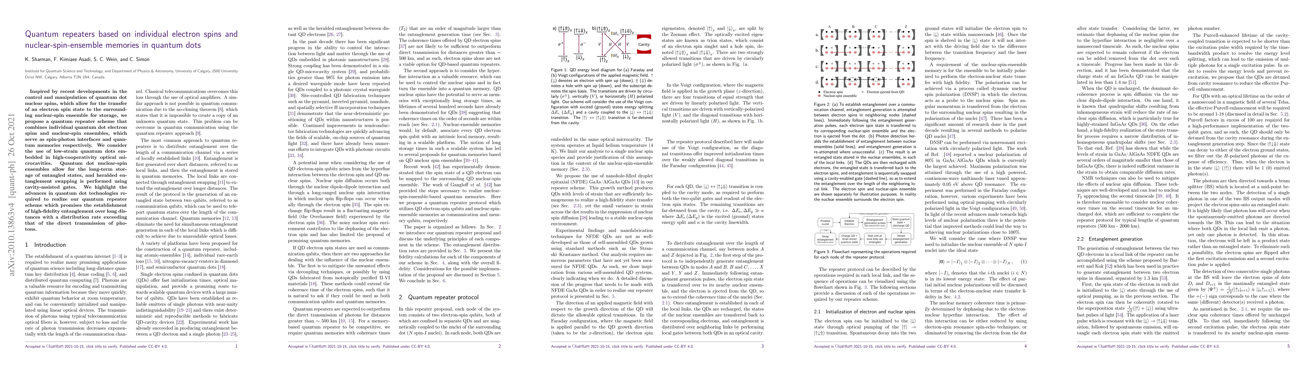 This paper proposes a quantum repeater scheme utilizing individual electron spins in quantum dots and nuclear-spin ensembles for quantum memory, enabling long-term storage and high-fidelity entanglement over long distances. The scheme leverages low-strain quantum dots in optical microcavities for enhanced performance.