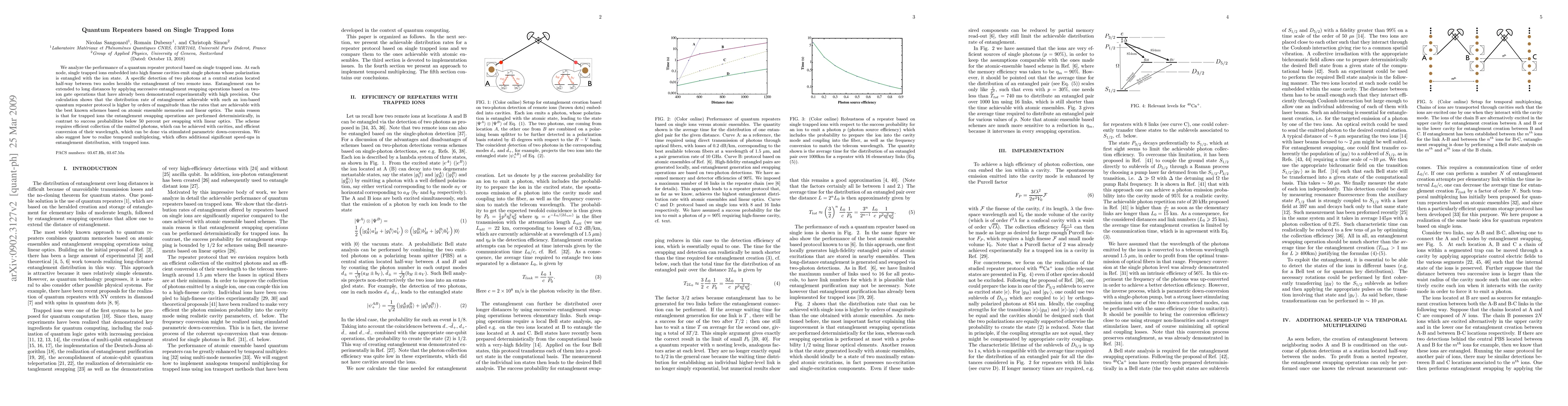This paper evaluates a quantum repeater protocol utilizing single trapped ions, showing it achieves significantly higher entanglement distribution rates compared to atomic ensemble or linear optics methods due to deterministic entanglement swapping. The protocol requires efficient photon collection and wavelength conversion, with potential for speed-ups through temporal multiplexing.