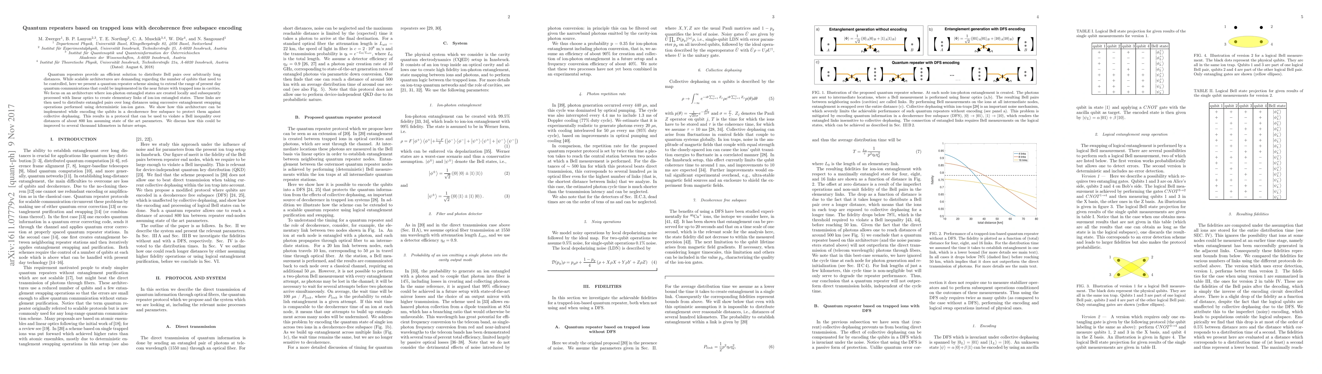 This paper proposes a quantum repeater scheme using trapped ions to extend quantum communication distances, employing ion-photon entanglement and linear optics to create ion-ion entangled links. The qubits are encoded in a decoherence-free subspace to mitigate dephasing, enabling Bell inequality violations over 800 km with current technology. Future improvements could extend this range to several thousand kilometers.