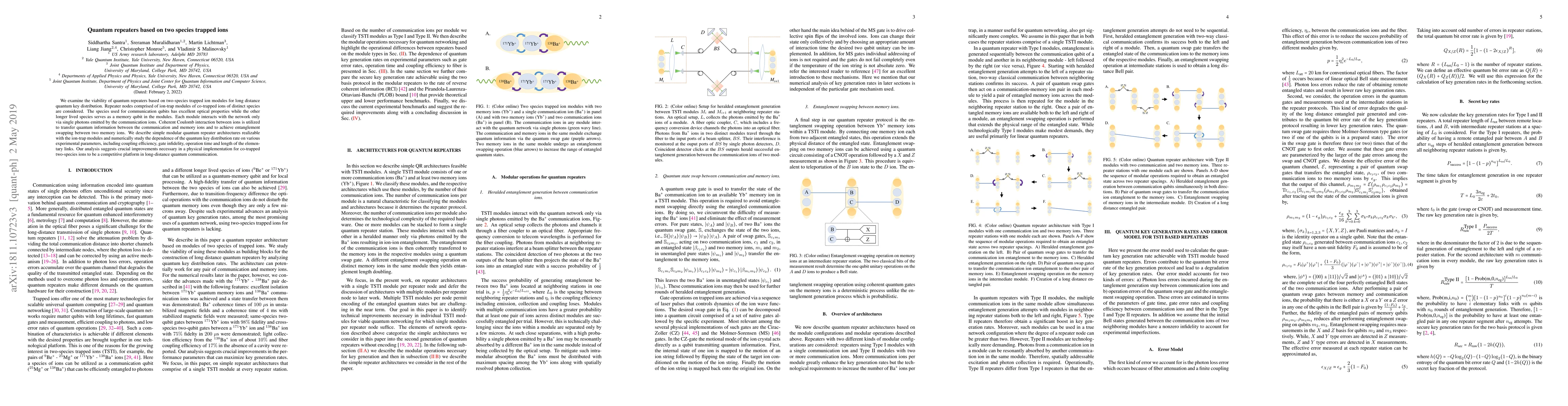 This paper explores the feasibility of quantum repeaters using two-species trapped ions for long-distance quantum key distribution. The proposed repeaters utilize distinct ion species for communication and memory qubits, with entanglement swapping achieved via Coulomb interaction. The study identifies necessary improvements for practical implementation.