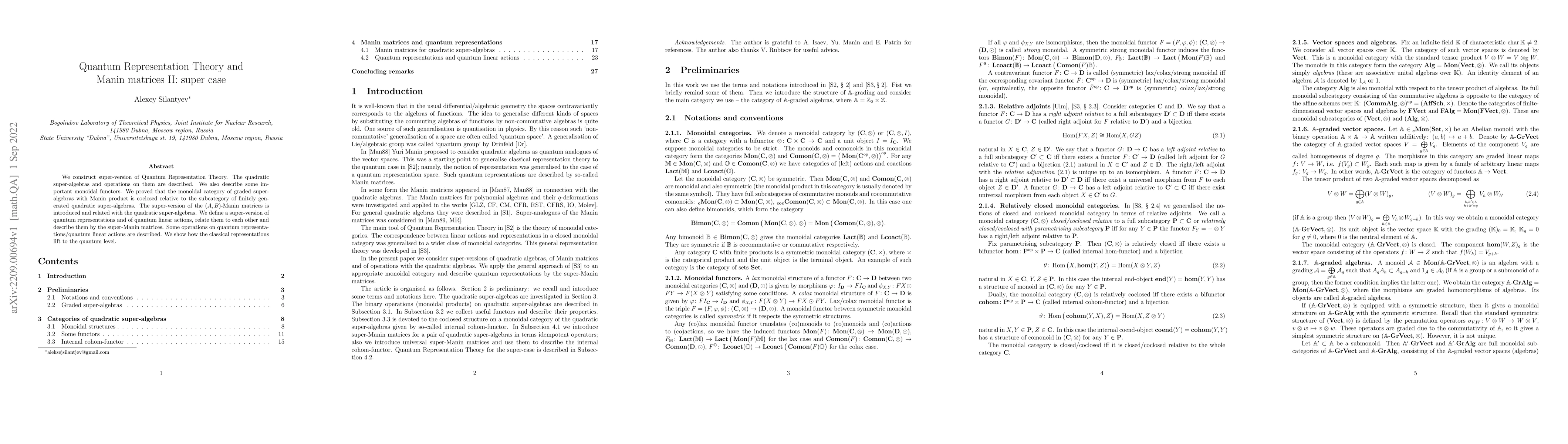 This paper constructs a super-version of Quantum Representation Theory, detailing quadratic super-algebras and associated operations. It introduces the super-Manin matrices and demonstrates how classical representations can be lifted to the quantum level, establishing the coclosed nature of the relevant monoidal category.