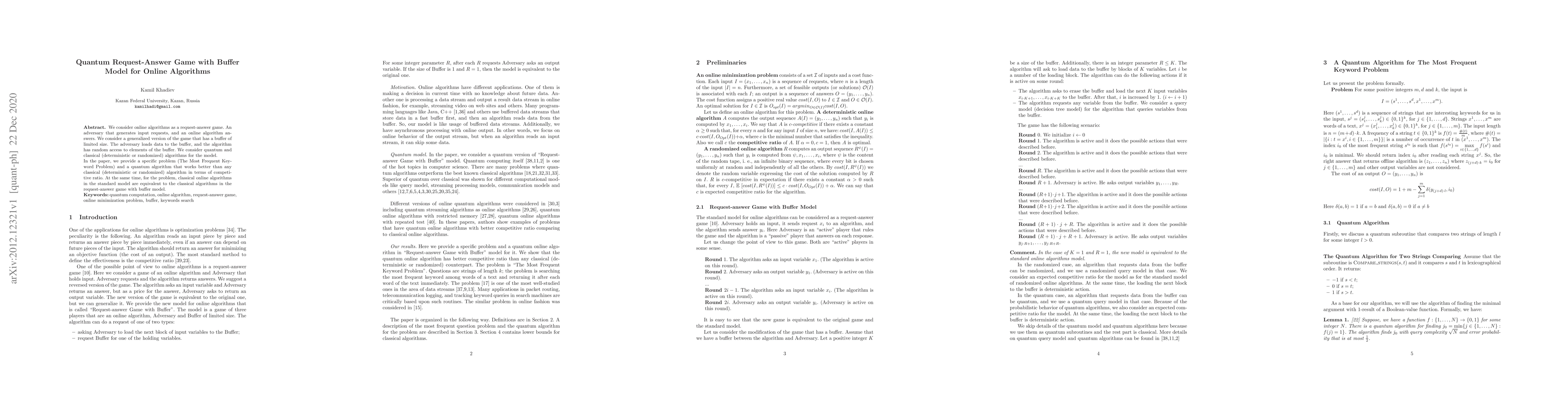 This paper explores online algorithms through a quantum request-answer game with a limited buffer model. It presents a quantum algorithm for the Most Frequent Keyword Problem that outperforms any classical algorithm in terms of competitive ratio, while classical algorithms remain equivalent in both standard and buffer models.