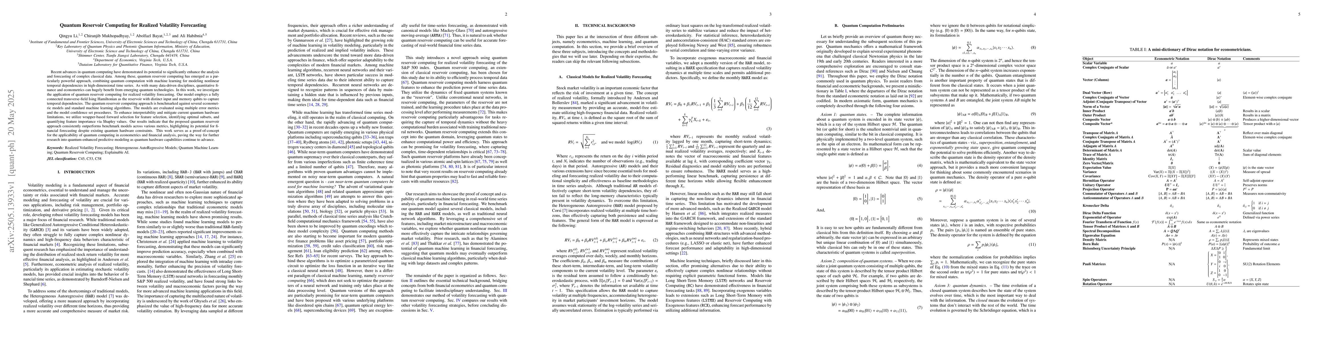 The development and implementation of a quantum reservoir computing model for realized volatility forecasting, benchmarked against traditional econometric models and machine learning algorithms, showcasing its superior performance.
