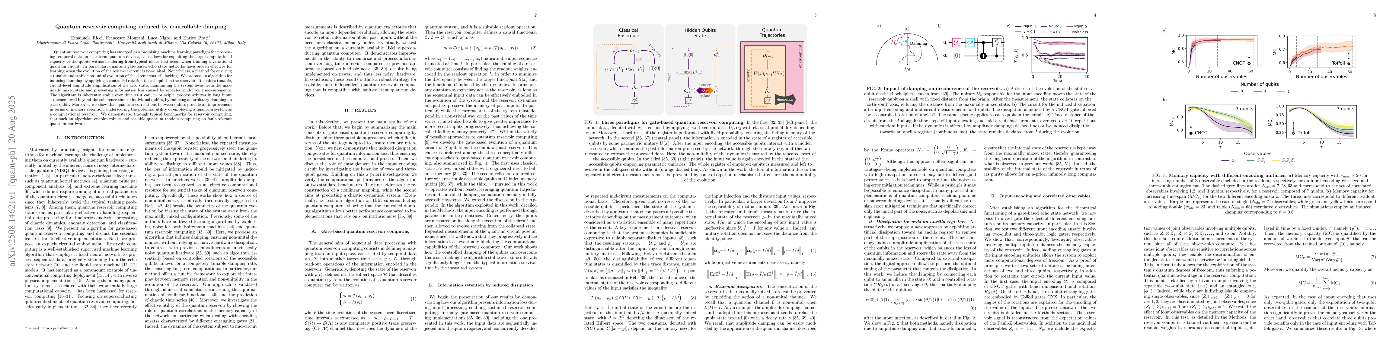 The novelty of this work lies in the explicit control of induced damping, contrasting with previous approaches relying on intrinsic hardware noise, and in leveraging quantum correlations to enhance memory capabilities in quantum reservoir computing.