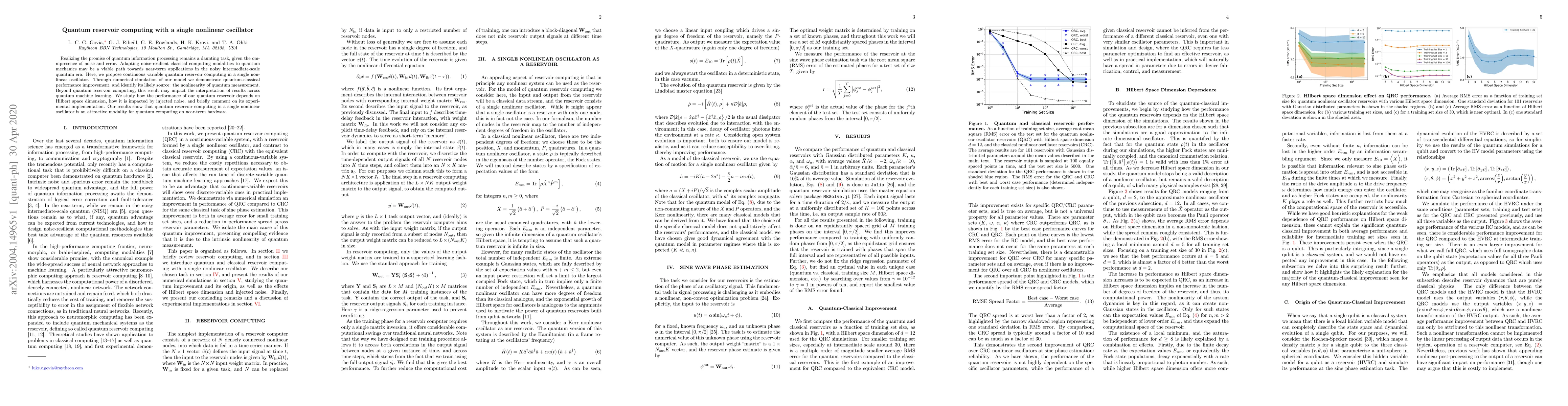 This paper proposes a quantum reservoir computing model using a single nonlinear oscillator, demonstrating improved quantum-classical performance due to quantum measurement nonlinearity. The study highlights its potential for near-term quantum computing applications and discusses the impact of noise and Hilbert space dimension on performance.