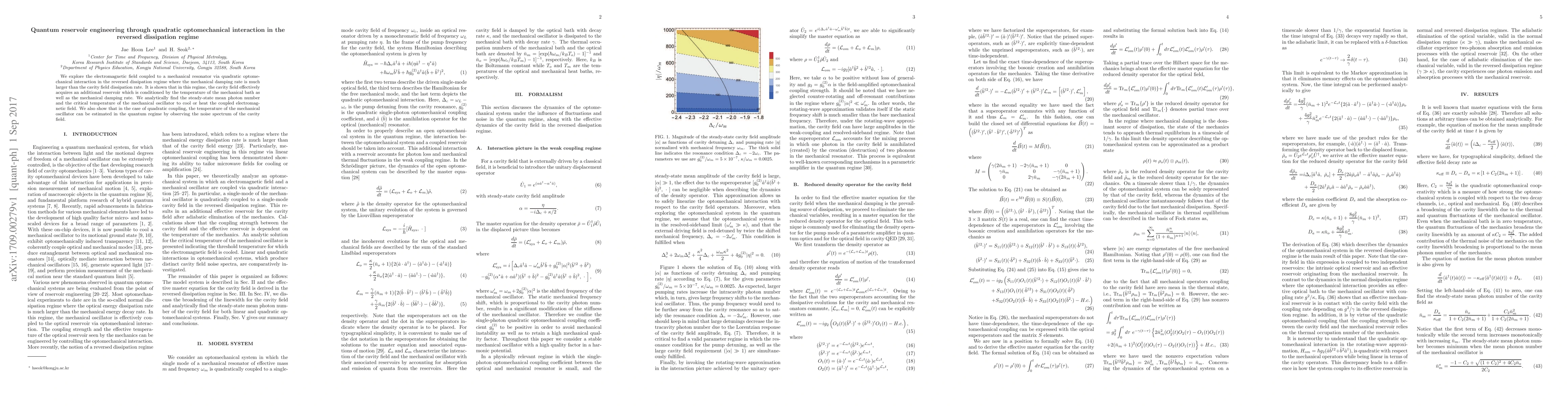 This paper investigates quadratic optomechanical interaction in a reversed dissipation regime, demonstrating that the cavity field acquires a conditioned reservoir influenced by the mechanical bath's temperature and damping rate. The study analytically determines the steady-state mean photon number and critical cooling temperature for the electromagnetic field, and shows that the mechanical oscillator's temperature can be estimated via the cavity field's noise spectrum.