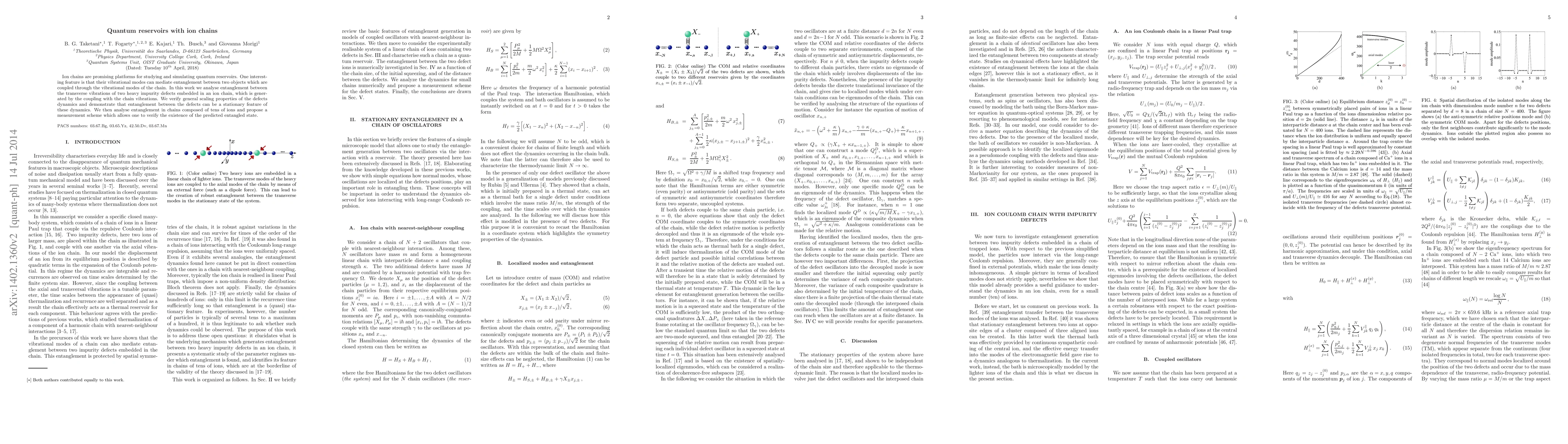 This paper investigates the entanglement dynamics in ion chains used as quantum reservoirs, focusing on the transverse vibrations of two heavy impurity defects. It demonstrates that entanglement can be a stable feature and proposes a measurement scheme to verify the existence of the predicted entangled state in chains composed of tens of ions.