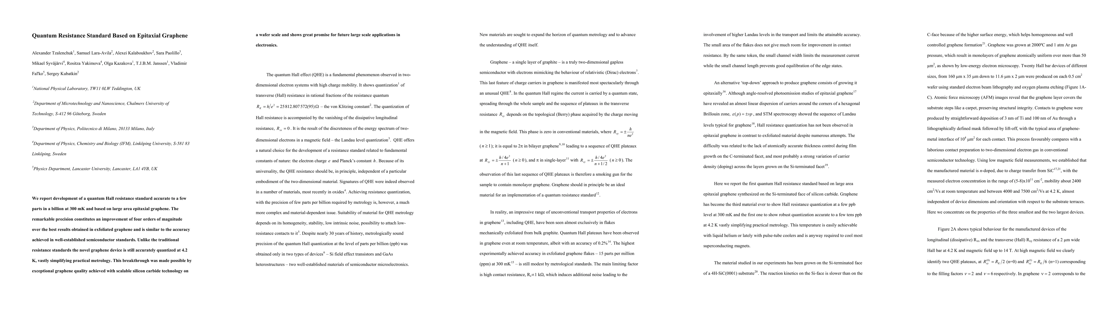 The paper reports the development of a highly precise quantum Hall resistance standard using large area epitaxial graphene, achieving accuracy four orders of magnitude better than exfoliated graphene and comparable to semiconductor standards. The novel graphene device maintains accuracy at 4.2 K, simplifying practical metrology, thanks to scalable silicon carbide technology.