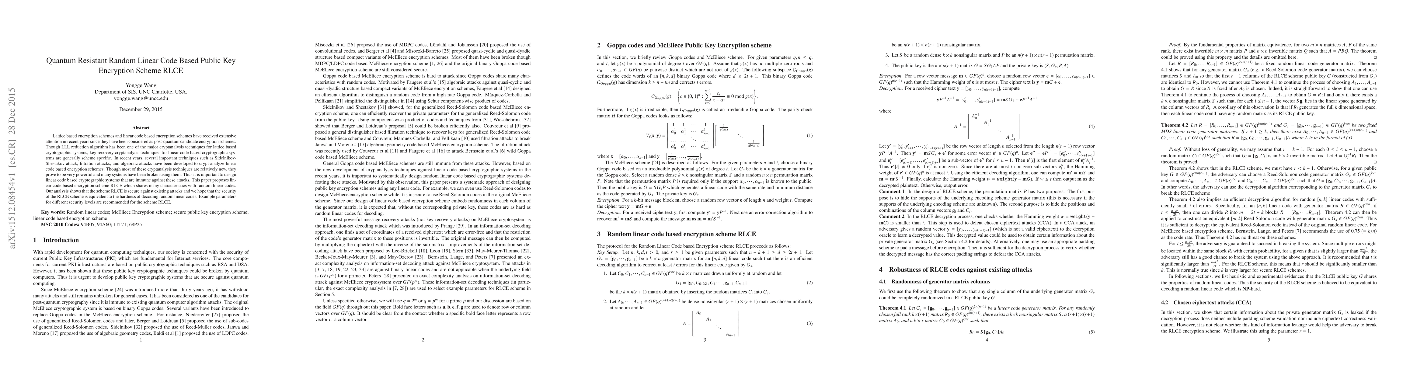 This paper proposes a quantum-resistant public key encryption scheme, RLCE, based on random linear codes to counter cryptanalysis techniques targeting linear code systems. The RLCE scheme is analyzed to be secure against existing attacks, with recommended parameters for various security levels.