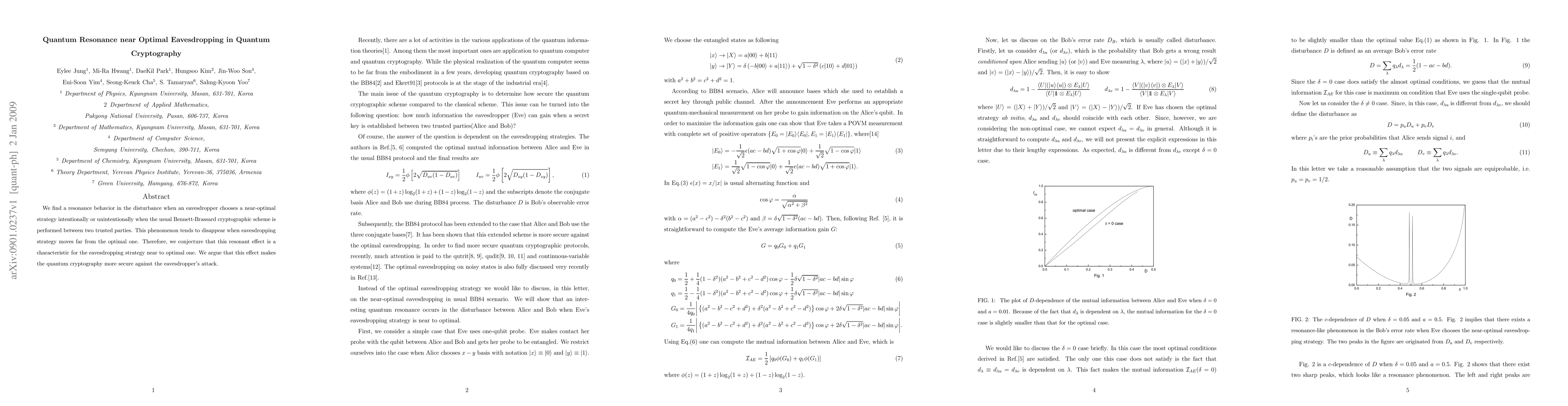 This paper identifies a resonance in disturbances during quantum cryptography when an eavesdropper employs near-optimal strategies, suggesting this effect enhances the security of quantum encryption against such attacks. The resonance diminishes as the eavesdropping strategy deviates from optimality.