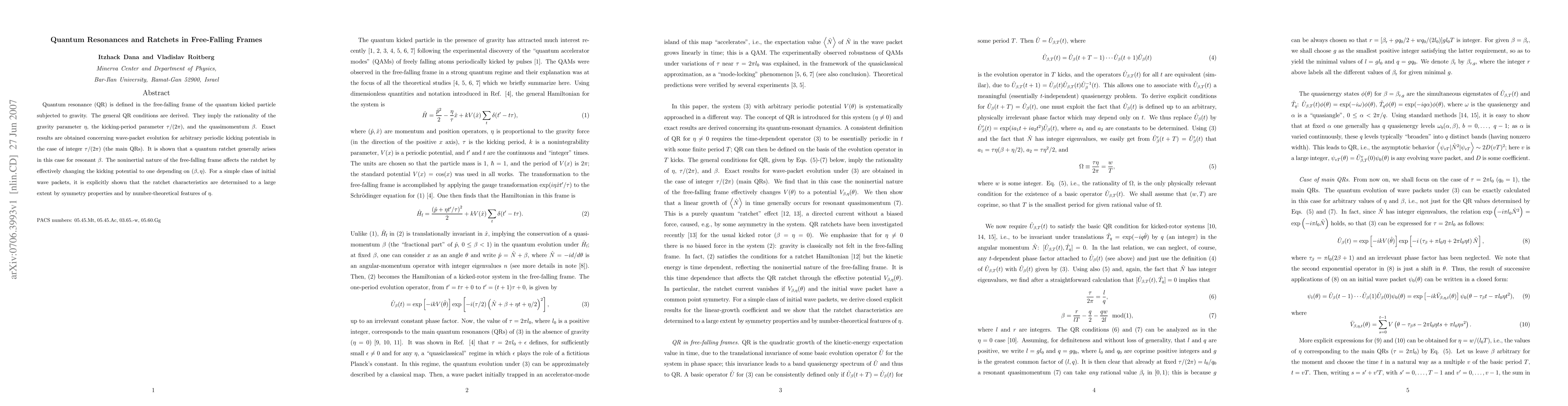 Quantum resonance (QR) is defined in the free-falling frame of the quantum kicked particle subjected to gravity. The general QR conditions are derived. They imply the rationality of the gravity parameter $\eta$, the kicking-period parameter $\tau /(2\pi)$, and the quasimomentum $\beta$. Exact results are obtained concerning wave-packet evolution for arbitrary periodic kicking potentials in the case of integer $\tau /(2\pi)$ (the main QRs). It is shown that a quantum ratchet generally arises in this case for resonant $\beta$. The noninertial nature of the free-falling frame affects the ratchet by effectively changing the kicking potential to one depending on $(\beta ,\eta)$. For a simple class of initial wave packets, it is explicitly shown that the ratchet characteristics are determined to a large extent by symmetry properties and by number-theoretical features of $\eta$.