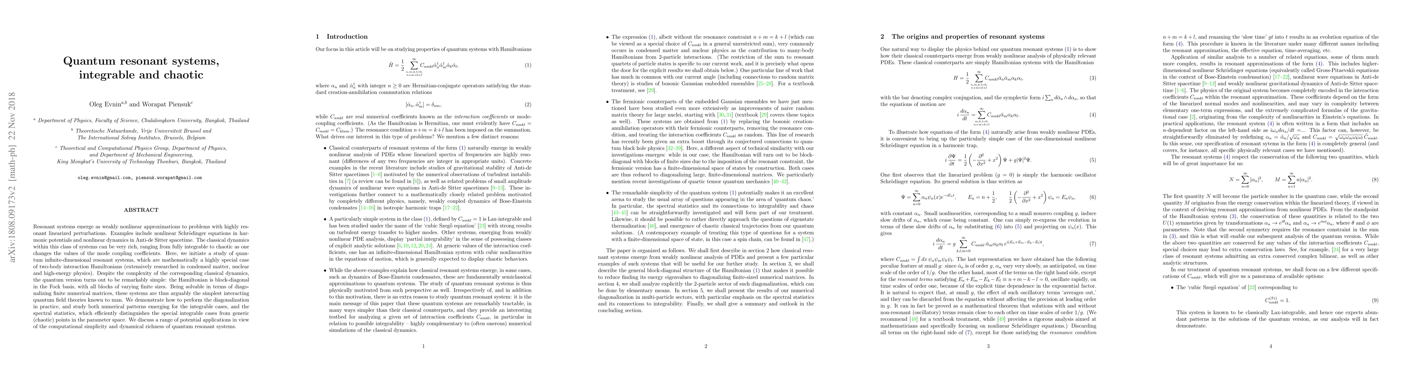 Resonant systems emerge as weakly nonlinear approximations to problems with highly resonant linearized perturbations. Examples include nonlinear Schroedinger equations in harmonic potentials and nonlinear dynamics in Anti-de Sitter spacetime. The classical dynamics within this class of systems can be very rich, ranging from fully integrable to chaotic as one changes the values of the mode coupling coefficients. Here, we initiate a study of quantum infinite-dimensional resonant systems, which are mathematically a highly special case of two-body interaction Hamiltonians (extensively researched in condensed matter, nuclear and high-energy physics). Despite the complexity of the corresponding classical dynamics, the quantum version turns out to be remarkably simple: the Hamiltonian is block-diagonal in the Fock basis, with all blocks of varying finite sizes. Being solvable in terms of diagonalizing finite numerical matrices, these systems are thus arguably the simplest interacting quantum field theories known to man. We demonstrate how to perform the diagonalization in practice, and study both numerical patterns emerging for the integrable cases, and the spectral statistics, which efficiently distinguishes the special integrable cases from generic (chaotic) points in the parameter space. We discuss a range of potential applications in view of the computational simplicity and dynamical richness of quantum resonant systems.