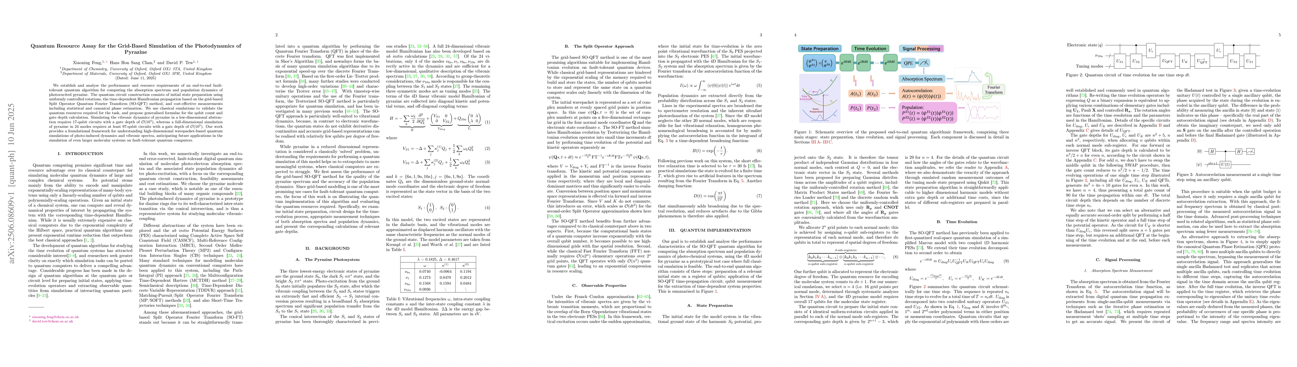 We establish and analyse the performance and resource requirements of an end-to-end fault-tolerant quantum algorithm for computing the absorption spectrum and population dynamics of photoexcited pyrazine. The quantum circuit construction consists of initial state preparation using uniformly controlled rotations, the time-dependent Hamiltonian propagation based on the grid-based Split Operator Quantum Fourier Transform (SO-QFT) method, and cost-effective measurements including statistical and canonical phase estimation. We use classical emulations to validate the quantum resources required for the task, and propose generalised formulae for the qubit count and gate depth calculation. Simulating the vibronic dynamics of pyrazine in a low-dimensional abstraction requires 17-qubit circuits with a gate depth of $\mathcal{O}(10^4)$, whereas a full-dimensional simulation of pyrazine in 24 modes requires at least 97-qubit circuits with a gate depth of $\mathcal{O}(10^5)$. Our work provides a foundational framework for understanding high-dimensional wavepacket-based quantum simulations of photo-induced dynamics and vibronic spectra, anticipating future applications in the simulation of even larger molecular systems on fault-tolerant quantum computers.