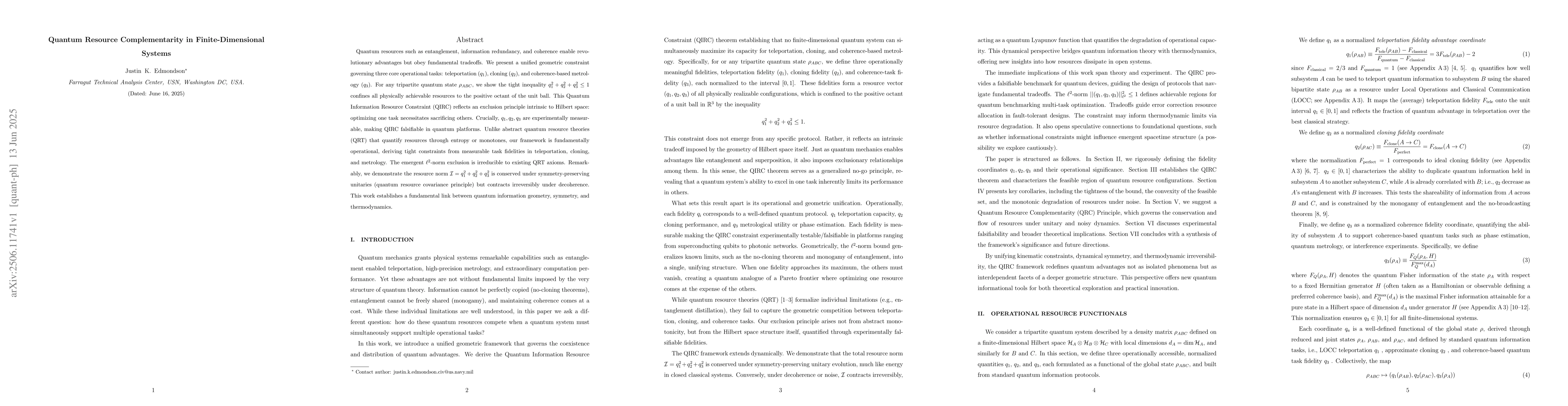Quantum resources such as entanglement, information redundancy, and coherence enable revolutionary advantages but obey fundamental tradeoffs. We present a unified geometric constraint governing three core operational tasks: teleportation ($q_1$), cloning ($q_2$), and coherence-based metrology ($q_3$). For any tripartite quantum state $\rho_{ABC}$, we show the tight inequality $q_1^2 + q_2^2 + q_3^2 \leq 1$ confines all physically achievable resources to the positive octant of the unit ball. This Quantum Information Resource Constraint (QIRC) reflects an exclusion principle intrinsic to Hilbert space: optimizing one task necessitates sacrificing others. Crucially, $q_1, q_2, q_3$ are experimentally measurable, making QIRC falsifiable in quantum platforms. Unlike abstract quantum resource theories (QRT) that quantify resources through entropy or monotones, our framework is fundamentally operational, deriving tight constraints from measurable task fidelities in teleportation, cloning, and metrology. The emergent \(\ell^2\)-norm exclusion is irreducible to existing QRT axioms. Remarkably, we demonstrate the resource norm $\mathcal{I} = q_1^2 + q_2^2 + q_3^2$ is conserved under symmetry-preserving unitaries (quantum resource covariance principle) but contracts irreversibly under decoherence. This work establishes a fundamental link between quantum information geometry, symmetry, and thermodynamics.