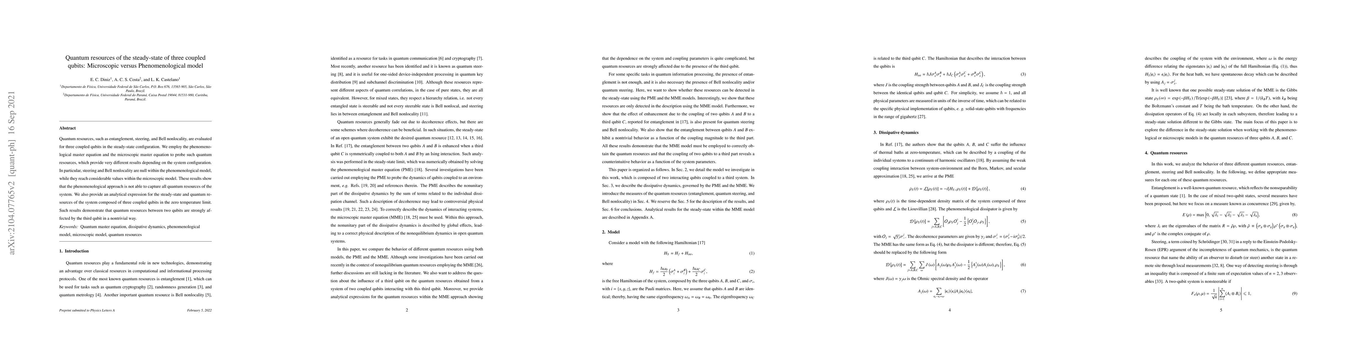 Researchers used two approaches to study three coupled qubits: a phenomenological model and a microscopic model. They found that the microscopic model better captured the system's quantum resources, including entanglement and Bell nonlocality.