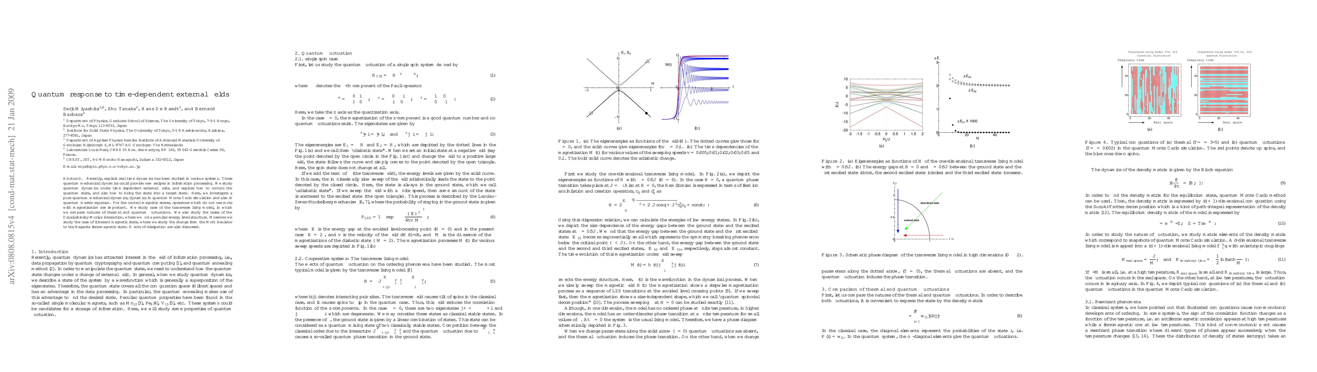 This paper investigates quantum dynamics under time-dependent external fields, focusing on controlling quantum states and transitioning them to target states. It explores dynamics via quantum Monte Carlo simulations and quantum master equations, particularly in the transverse Ising model, Dzyaloshinsky-Moriya interaction, and itinerant magnetic states, while discussing effects of dissipation.