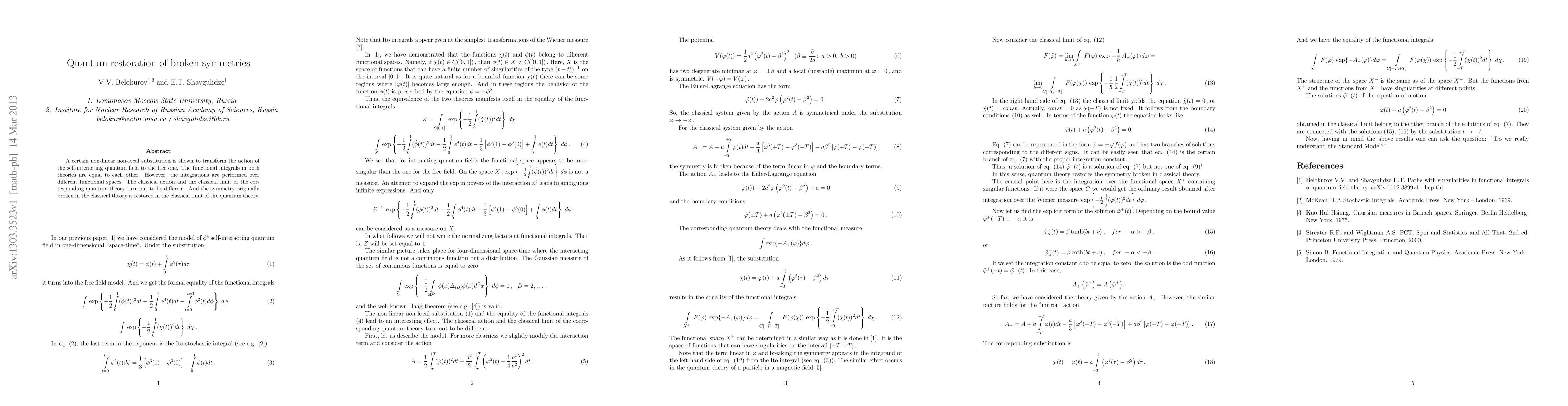A certain non-linear non-local substitution is shown to transform the action of the self-interacting quantum field to the free one. The functional integrals in both theories are equal to each other. However, the integrations are performed over different functional spaces. The classical action and the classical limit of the corresponding quantum theory turn out to be different. And the symmetry originally broken in the classical theory is restored in the classical limit of the quantum theory.