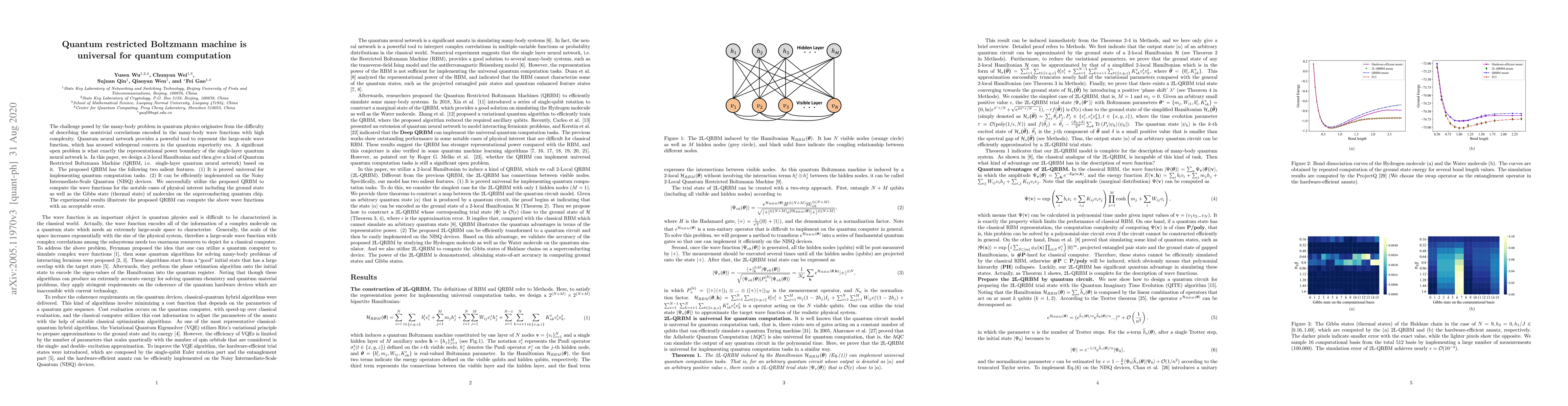 The challenge posed by the many-body problem in quantum physics originates from the difficulty of describing the nontrivial correlations encoded in the many-body wave functions with high complexity. Quantum neural network provides a powerful tool to represent the large-scale wave function, which has aroused widespread concern in the quantum superiority era. A significant open problem is what exactly the representational power boundary of the single-layer quantum neural network is. In this paper, we design a 2-local Hamiltonian and then give a kind of Quantum Restricted Boltzmann Machine (QRBM, i.e. single-layer quantum neural network) based on it. The proposed QRBM has the following two salient features. (1) It is proved universal for implementing quantum computation tasks. (2) It can be efficiently implemented on the Noisy Intermediate-Scale Quantum (NISQ) devices. We successfully utilize the proposed QRBM to compute the wave functions for the notable cases of physical interest including the ground state as well as the Gibbs state (thermal state) of molecules on the superconducting quantum chip. The experimental results illustrate the proposed QRBM can compute the above wave functions with an acceptable error.