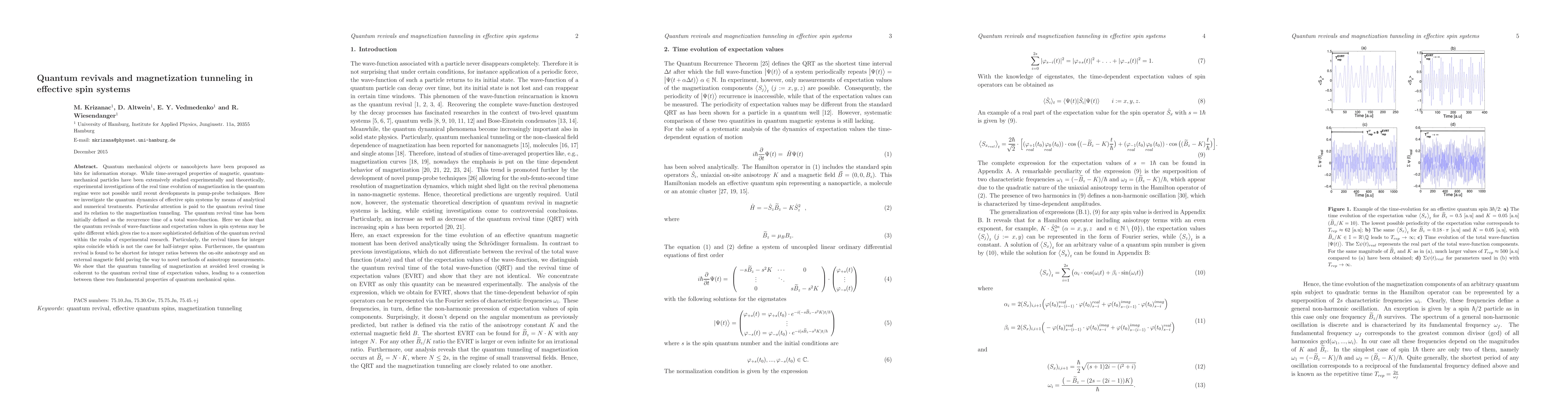 This paper explores the quantum dynamics of effective spin systems, focusing on quantum revivals and magnetization tunneling. It reveals that quantum revivals of wave-functions and expectation values differ, especially for integer versus half-integer spins, and identifies a connection between quantum tunneling of magnetization and the quantum revival time.