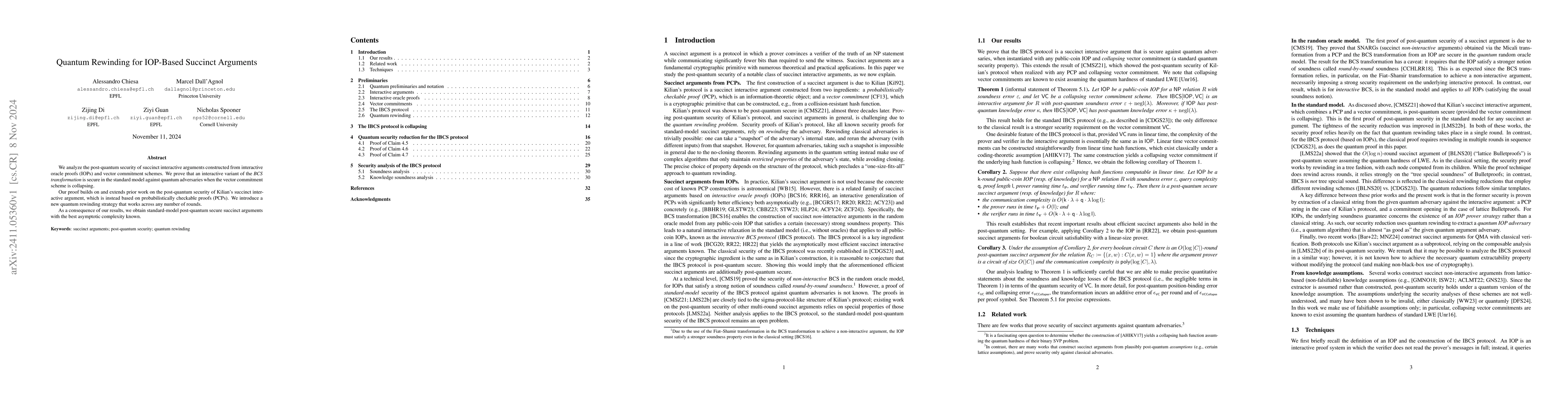 The paper analyzes post-quantum security for succinct interactive arguments built from interactive oracle proofs and vector commitments, proving security of a quantum BCS transformation against quantum adversaries. It introduces a novel quantum rewinding strategy applicable across multiple rounds, leading to the best known asymptotic complexity for standard-model post-quantum secure succinct arguments.