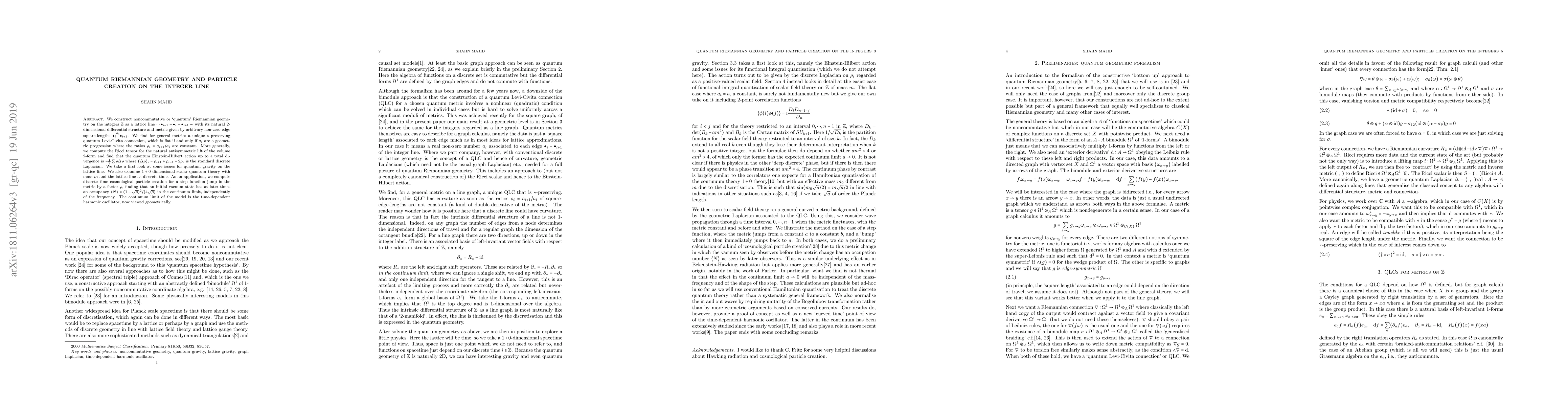 This research constructs a quantum Riemannian geometry on the integer line, introducing a unique quantum Levi-Civita connection. It derives a quantum Einstein-Hilbert action and explores scalar quantum theory on this lattice line, calculating discrete time cosmological particle creation for a step function metric change. The model simplifies to a time-dependent harmonic oscillator in the continuum limit.