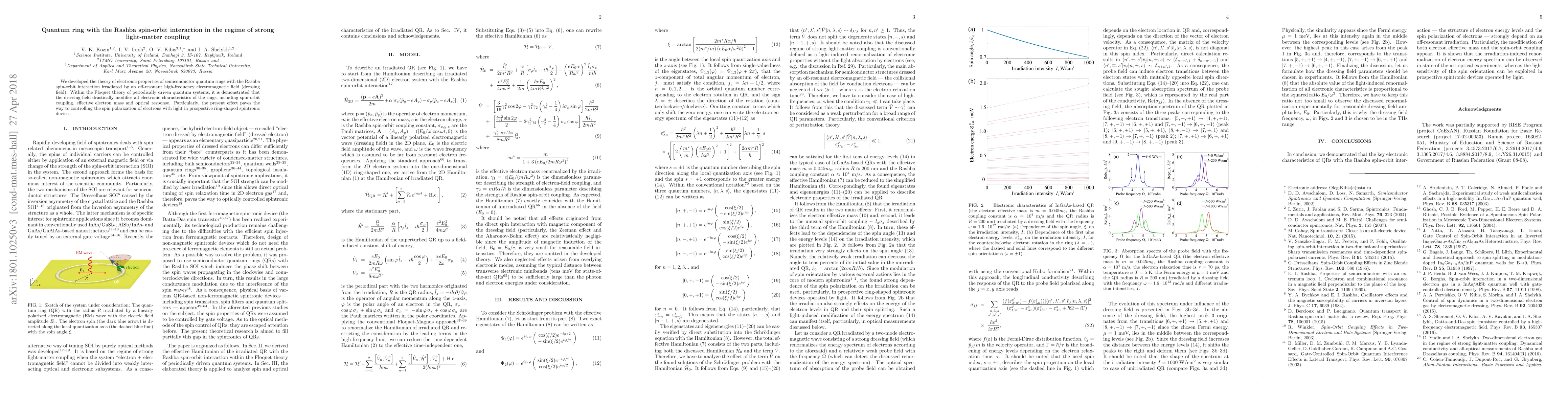 This paper develops a theoretical framework for semiconductor quantum rings with Rashba spin-orbit interaction under a strong light-matter coupling regime. The study reveals that an off-resonant high-frequency electromagnetic field significantly alters the electronic properties, including spin-orbit coupling and optical response, potentially enabling light-controlled spin polarization in future spintronic devices.