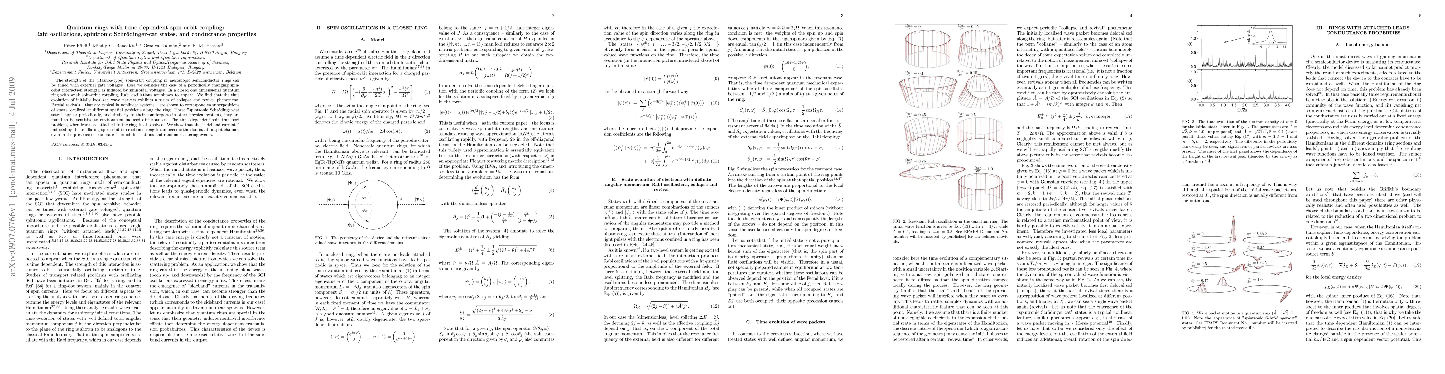 The strength of the (Rashba-type) spin-orbit coupling in mesoscopic semiconductor rings can be tuned with external gate voltages. Here we consider the case of a periodically changing spin-orbit interaction strength as induced by sinusoidal voltages. In a closed one dimensional quantum ring with weak spin-orbit coupling, Rabi oscillations are shown to appear. We find that the time evolution of initially localized wave packets exhibits a series of collapse and revival phenomena. Partial revivals -- that are typical in nonlinear systems -- are shown to correspond to superpositions of states localized at different spatial positions along the ring. These "spintronic Schrodinger-cat sates" appear periodically, and similarly to their counterparts in other physical systems, they are found to be sensitive to environment induced disturbances. The time dependent spin transport problem, when leads are attached to the ring, is also solved. We show that the "sideband currents" induced by the oscillating spin-orbit interaction strength can become the dominant output channel, even in the presence of moderate thermal fluctuations and random scattering events.