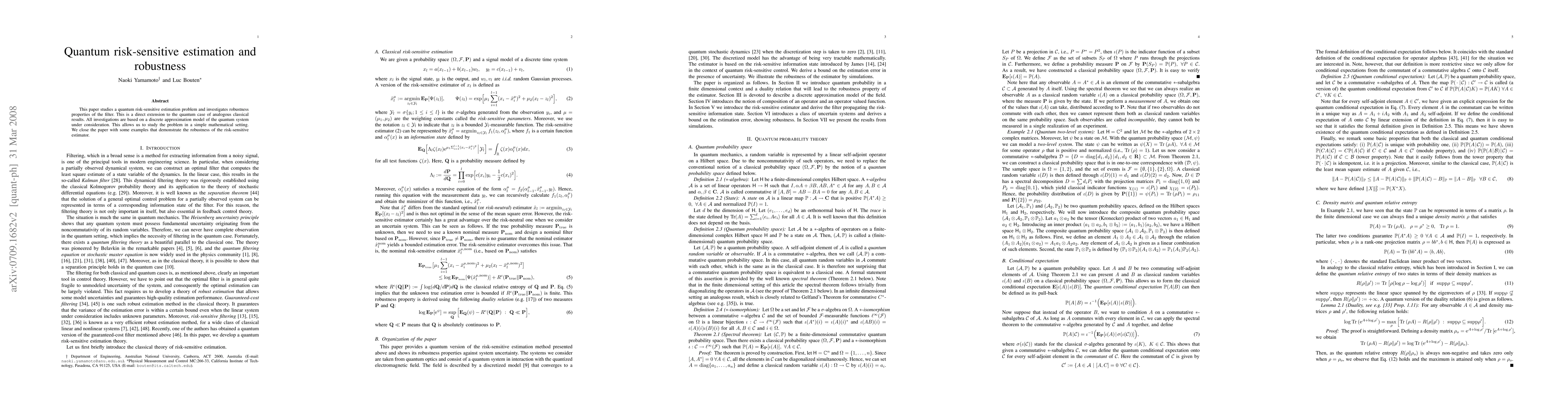 This paper studies a quantum risk-sensitive estimation problem and investigates robustness properties of the filter. This is a direct extension to the quantum case of analogous classical results. All investigations are based on a discrete approximation model of the quantum system under consideration. This allows us to study the problem in a simple mathematical setting. We close the paper with some examples that demonstrate the robustness of the risk-sensitive estimator.
