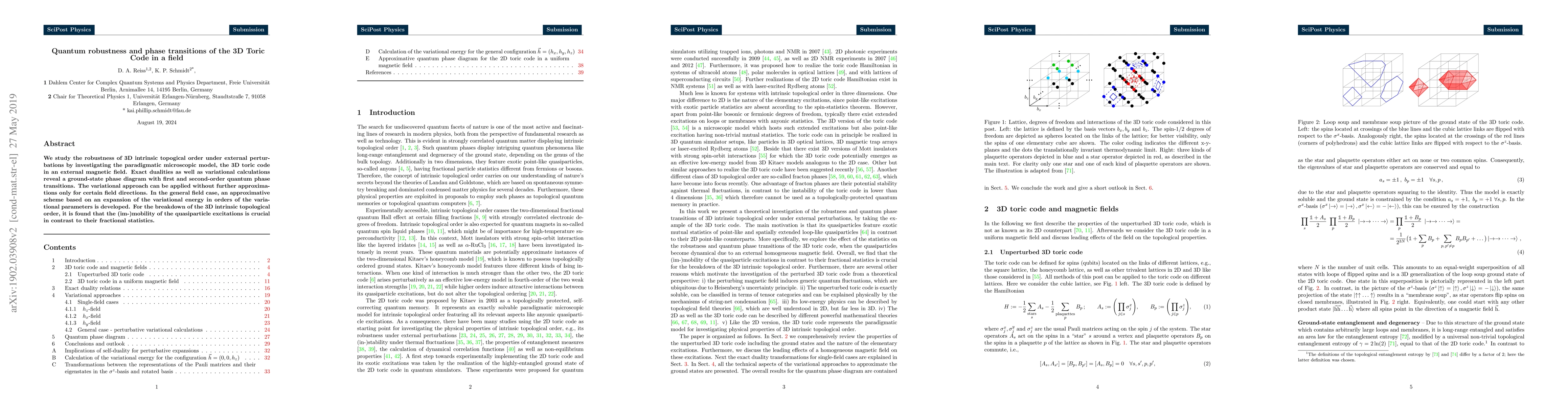 This paper investigates the robustness of 3D topological order in the toric code model under external magnetic fields, revealing a phase diagram with first and second-order quantum phase transitions. The study develops an approximative scheme for variational calculations, highlighting that quasiparticle immobility, rather than their fractional statistics, is key to the breakdown of topological order.