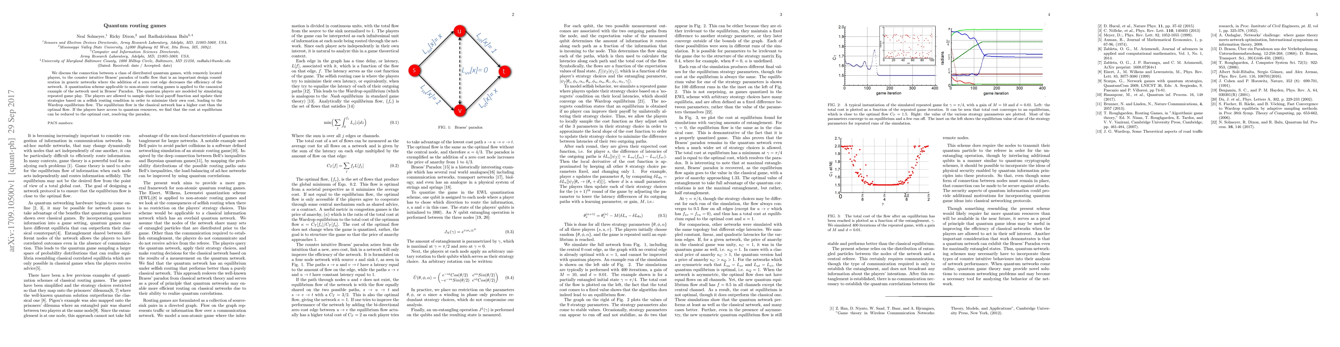 We discuss the connection between a class of distributed quantum games, with remotely located players, to the counter intuitive Braess' paradox of traffic flow that is an important design consideration in generic networks where the addition of a zero cost edge decreases the efficiency of the network. A quantization scheme applicable to non-atomic routing games is applied to the canonical example of the network used in Braess' Paradox. The quantum players are modeled by simulating repeated game play. The players are allowed to sample their local payoff function and update their strategies based on a selfish routing condition in order to minimize their own cost, leading to the Wardrop equilibrium flow. The equilibrium flow in the classical network has a higher cost than the optimal flow. If the players have access to quantum resources, we find that the cost at equilibrium can be reduced to the optimal cost, resolving the paradox.