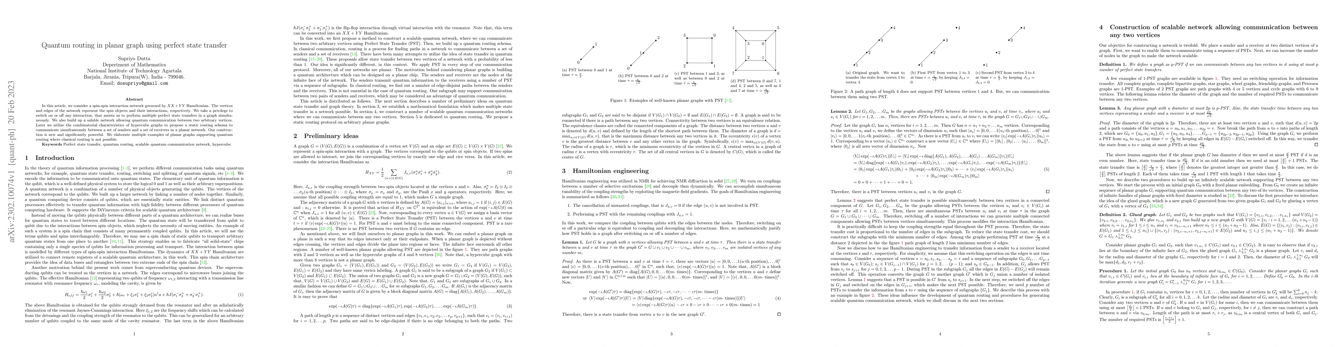 In this article, we consider a spin-spin interaction network governed by $XX + YY$ Hamiltonian. The vertices and edges of the network represent the spin objects and their interactions, respectively. We take a privilege to switch on or off any interaction, that assists us to perform multiple perfect state transfers in a graph simultaneously. We also build up a salable network allowing quantum communication between two arbitrary vertices. Later we utilize the combinatorial characteristics of hypercube graphs to propose a static routing schema to communicate simultaneously between a set of senders and a set of receivers in a planar network. Our construction is new and significantly powerful. We elaborate multiple examples of planar graphs supporting quantum routing where classical routing is not possible.
