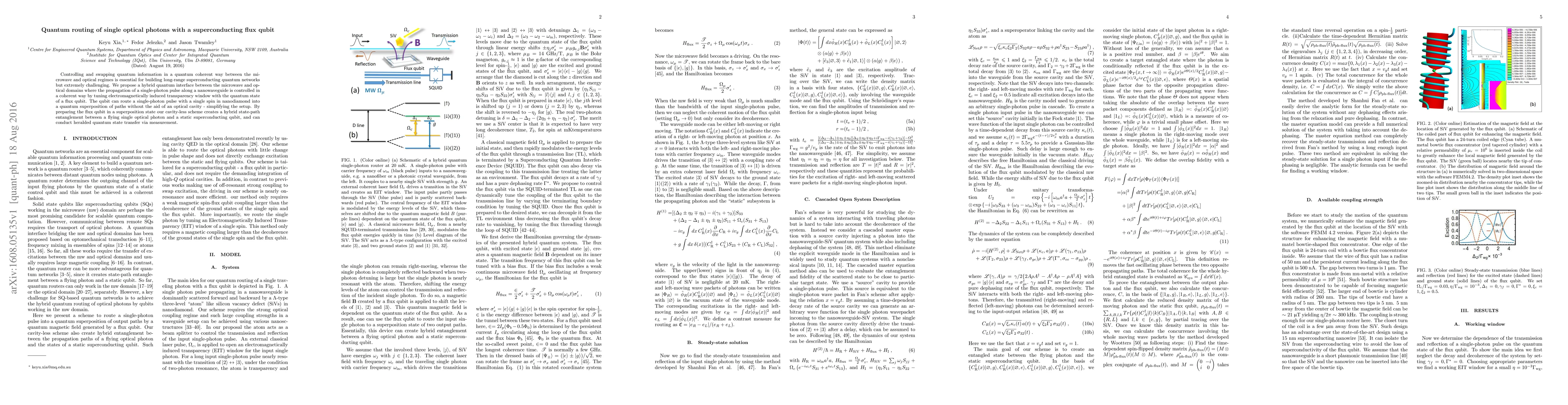 This paper proposes a hybrid quantum interface to control the routing of single optical photons using a superconducting flux qubit, enabling coherent quantum information transfer between microwave and optical regimes without optical cavities. The setup leverages electromagnetically induced transparency and qubit superposition to create entanglement and facilitate quantum state transfer.