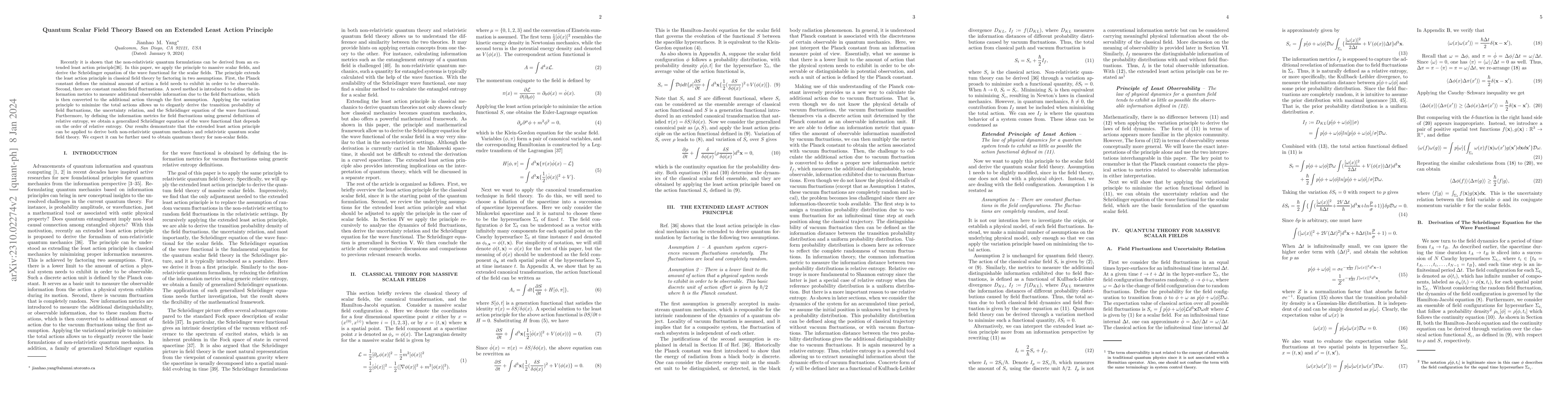 Recently it is shown that the non-relativistic quantum formulations can be derived from a least observability principle [36]. In this paper, we apply the principle to massive scalar fields, and derive the Schr\"{o}dinger equation of the wave functional for the scalar fields. The principle extends the least action principle in classical field theory by factoring in two assumptions. First, the Planck constant defines the minimal amount of action a field needs to exhibit in order to be observable. Second, there are constant random field fluctuations. A novel method is introduced to define the information metrics to measure additional observable information due to the field fluctuations, \added{which is then converted to the additional action through the first assumption.} Applying the variation principle to minimize the total actions allows us to elegantly derive the transition probability of field fluctuations, the uncertainty relation, and the Schr\"{o}dinger equation of the wave functional. Furthermore, by defining the information metrics for field fluctuations using general definitions of relative entropy, we obtain a generalized Schr\"{o}dinger equation of the wave functional that depends on the order of relative entropy. Our results demonstrate that the extended least action principle can be applied to derive both non-relativistic quantum mechanics and relativistic quantum scalar field theory. We expect it can be further used to obtain quantum theory for non-scalar fields.