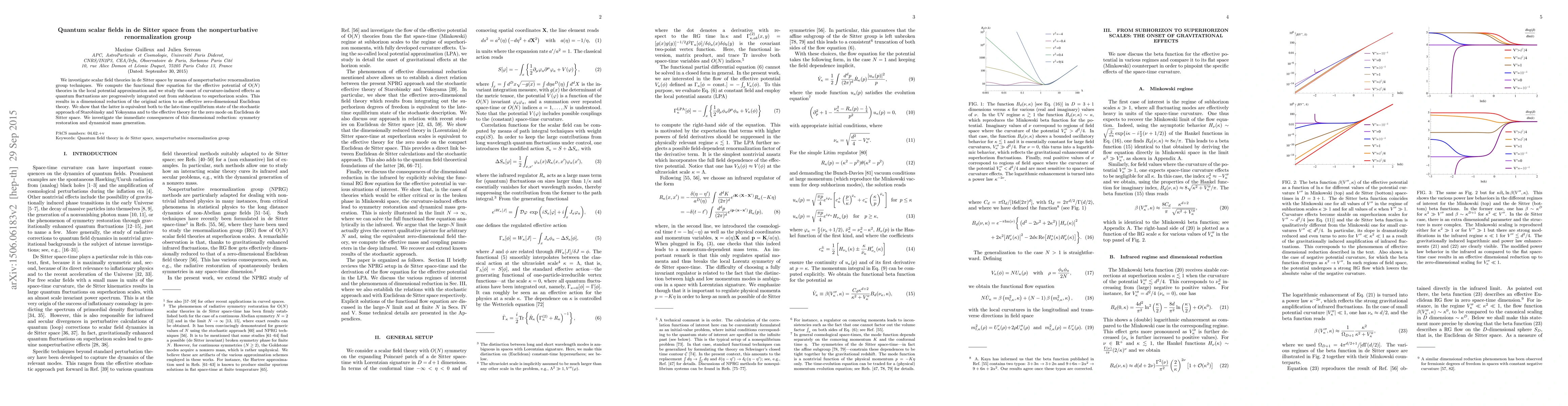 This paper uses nonperturbative renormalization group methods to study scalar field theories in de Sitter space, demonstrating a dimensional reduction to an effective zero-dimensional theory. It reveals symmetry restoration and dynamical mass generation due to curvature-induced quantum fluctuations.