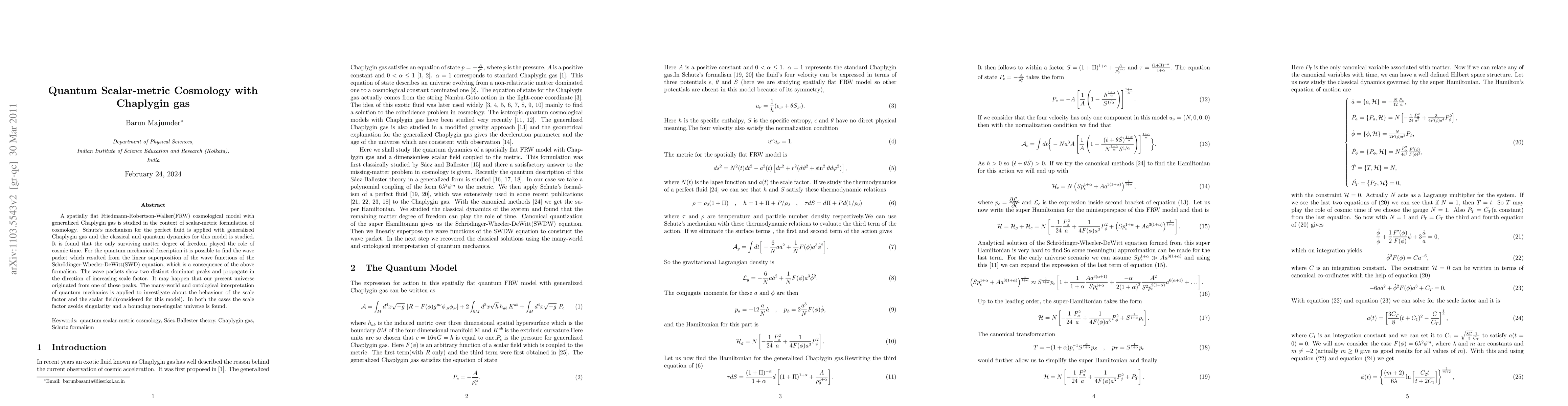 This paper explores a quantum scalar-metric cosmology model using generalized Chaplygin gas within a Friedmann-Robertson-Walker framework. It finds that the model avoids singularities and suggests a non-singular bouncing universe, with wave packets indicating potential origins of our universe from distinct peaks.