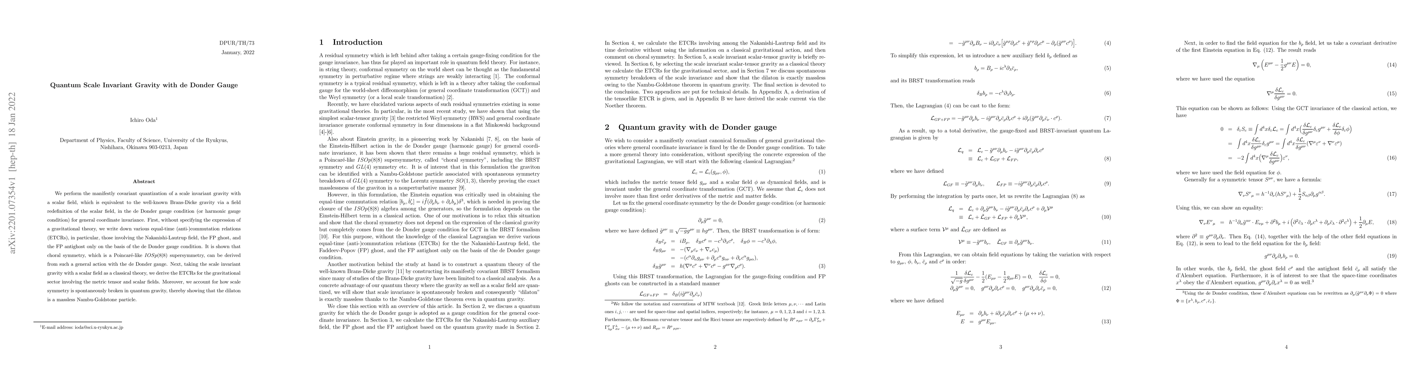 This paper quantizes scale invariant gravity with a scalar field in the de Donder gauge, deriving equal-time commutation relations and showing that choral symmetry emerges. It also demonstrates spontaneous breaking of scale symmetry, resulting in a massless Nambu-Goldstone dilaton.