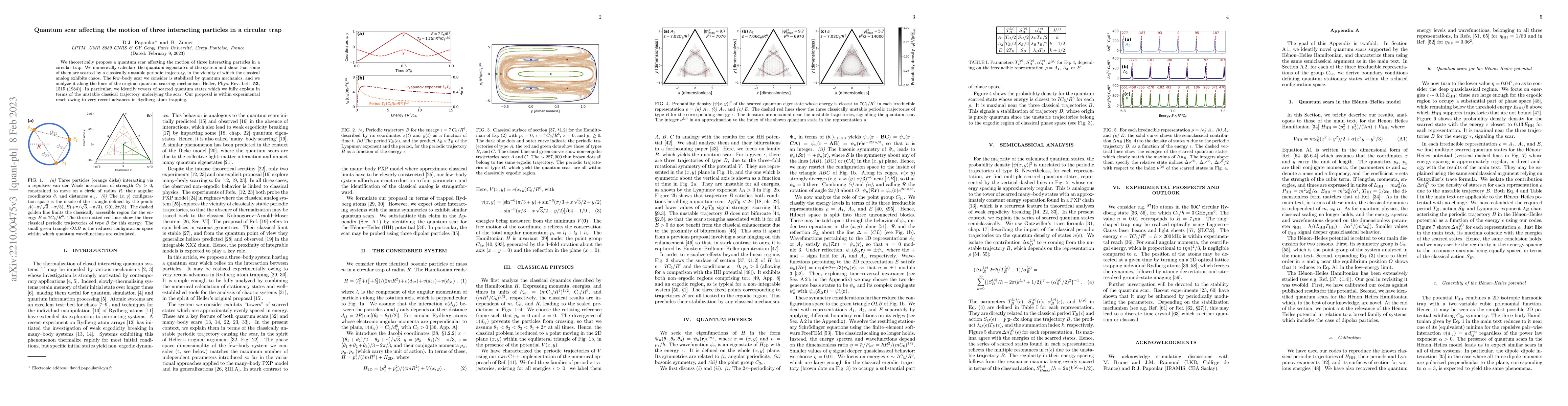 This paper proposes a quantum scar phenomenon in a system of three interacting particles in a circular trap, demonstrating numerically that certain quantum eigenstates are influenced by a classically unstable periodic trajectory. The study identifies and explains towers of scarred quantum states, suggesting a feasible experimental realization using recent Rydberg atom trapping technology.