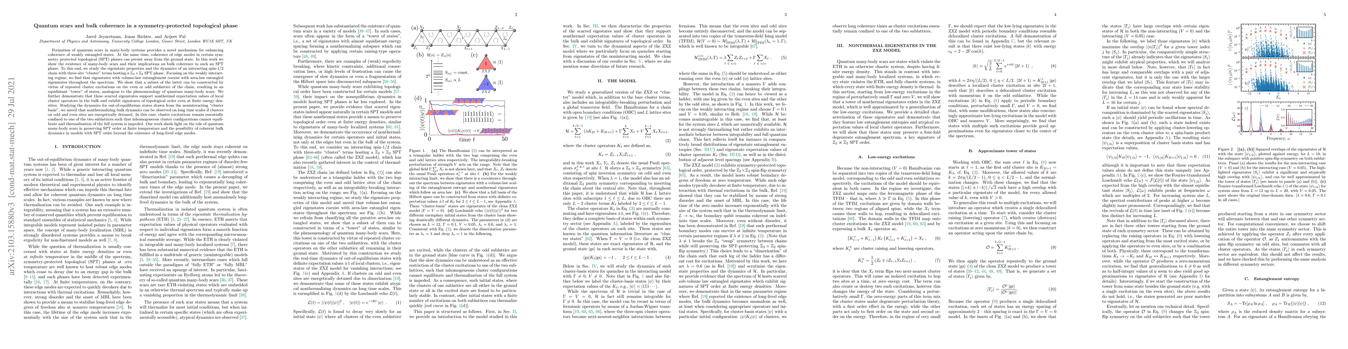 This research identifies quantum scars in a symmetry-protected topological (SPT) phase of an interacting spin-1/2 chain, showing coexistence of volume-law and area-law entangled eigenstates. These scarred states, formed by cluster excitations, maintain nonthermal bulk coherence and topological order, even at finite energy densities, highlighting the role of quantum scars in preserving SPT order and enabling coherent bulk dynamics.