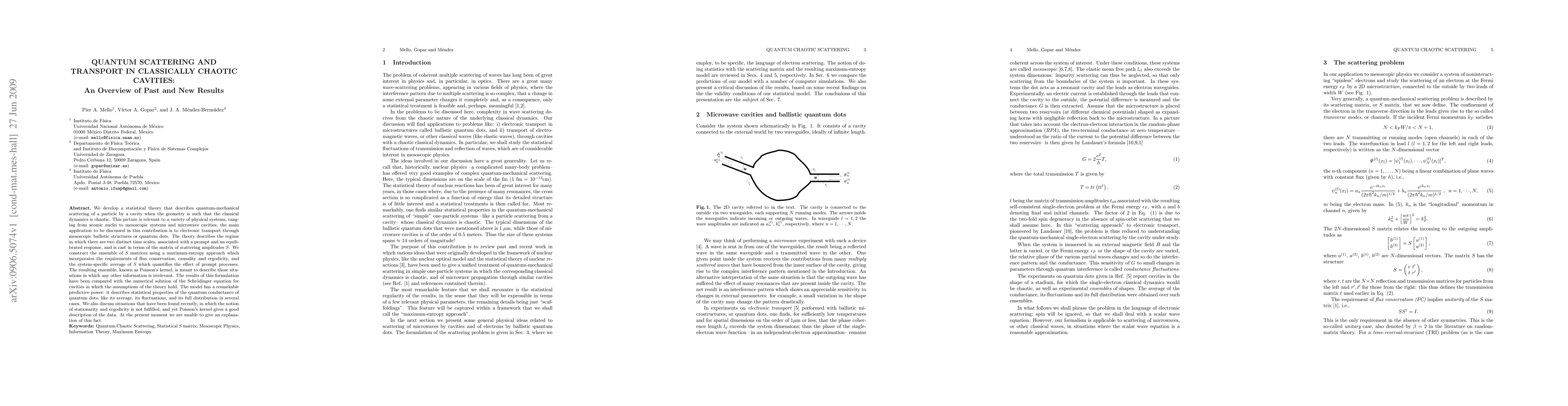 We develop a statistical theory that describes quantum-mechanical scattering of a particle by a cavity when the geometry is such that the classical dynamics is chaotic. This picture is relevant to a variety of physical systems, ranging from atomic nuclei to mesoscopic systems and microwave cavities; the main application to be discussed in this contribution is to electronic transport through mesoscopic ballistic structures or quantum dots. The theory describes the regime in which there are two distinct time scales, associated with a prompt and an equilibrated response, and is cast in terms of the matrix of scattering amplitudes S. We construct the ensemble of S matrices using a maximum-entropy approach which incorporates the requirements of flux conservation, causality and ergodicity, and the system-specific average of S which quantifies the effect of prompt processes. The resulting ensemble, known as Poisson's kernel, is meant to describe those situations in which any other information is irrelevant. The results of this formulation have been compared with the numerical solution of the Schroedinger equation for cavities in which the assumptions of the theory hold. The model has a remarkable predictive power: it describes statistical properties of the quantum conductance of quantum dots, like its average, its fluctuations, and its full distribution in several cases. We also discuss situations that have been found recently, in which the notion of stationarity and ergodicity is not fulfilled, and yet Poisson's kernel gives a good description of the data. At the present moment we are unable to give an explanation of this fact.