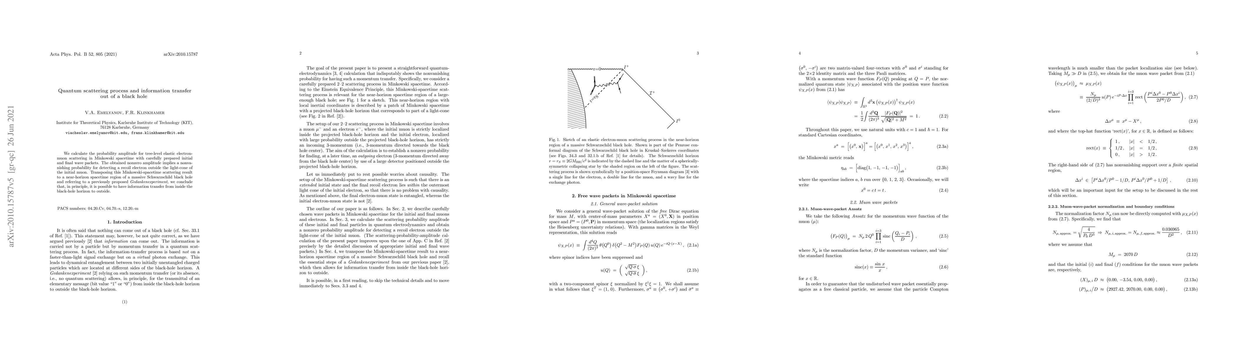 We calculate the probability amplitude for tree-level elastic electron-muon scattering in Minkowski spacetime with carefully prepared initial and final wave packets. The obtained nonzero amplitude implies a nonvanishing probability for detecting a recoil electron outside the light-cone of the initial muon. Transposing this Minkowski-spacetime scattering result to a near-horizon spacetime region of a massive Schwarzschild black hole and referring to a previously proposed Gedankenexperiment, we conclude that, in principle, it is possible to have information transfer from inside the black-hole horizon to outside.