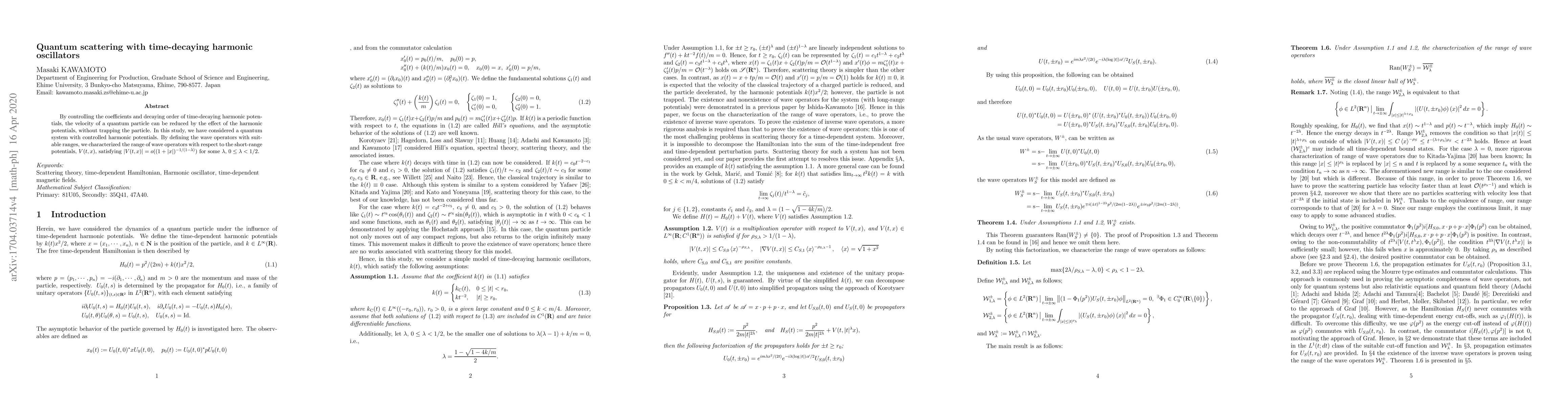 By controlling coefficients and decaying order of time-decaying harmonic potentials, the velocity of a quantum particle is decelerated by the effect of harmonic potentials but the particle is non-trapping. In this paper, we consider the quantum system with controlled harmonic potentials. By defining the wave operators for this system and suitable range of these, we can prove the existence and completeness of wave operators with respect to the short-range potentials $V(t,x)$ satisfying $|V(t,x)| = o ((1+|x|)^{-1/(1- \lambda)})$, for some $\lambda$, $0< \lambda < 1/2$.