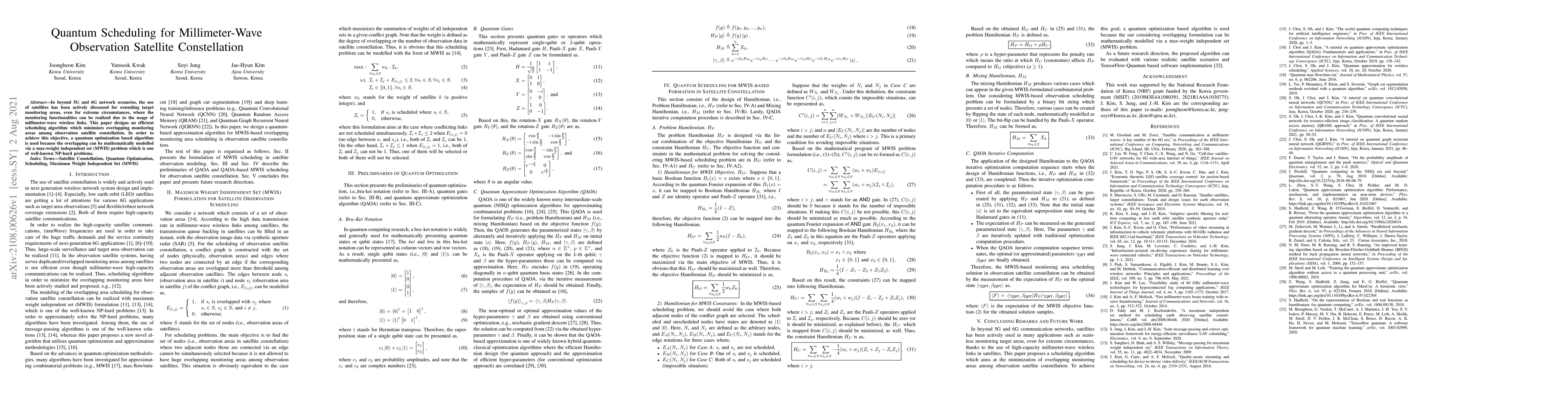 This paper proposes a quantum scheduling algorithm to minimize overlapping monitoring areas for millimeter-wave observation satellite constellations, using a max-weight independent set problem modelled via an NP-hard optimization challenge.