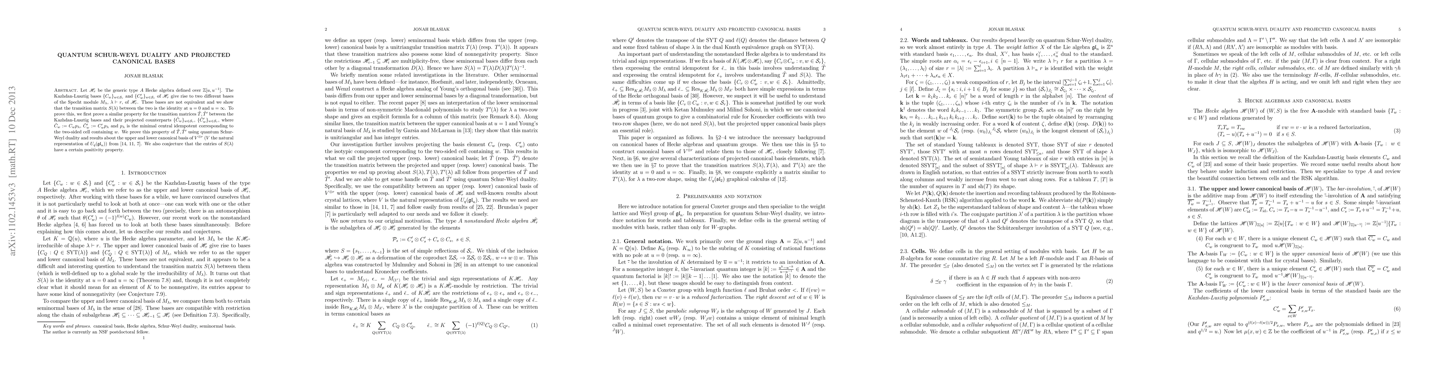 Let \H_r be the generic type A Hecke algebra defined over \ZZ[u, u^{-1}]. The Kazhdan-Lusztig bases \{C_w\}_{w \in \S_r} and \{C'_w\}_{w \in \S_r} of \H_r give rise to two different bases of the Specht module M_\lambda, \lambda \vdash r, of \H_r. These bases are not equivalent and we show that the transition matrix S(\lambda) between the two is the identity at u = 0 and u = \infty. To prove this, we first prove a similar property for the transition matrices \tilde{T}, \tilde{T}' between the Kazhdan-Lusztig bases and their projected counterparts \{\tilde{C}_w\}_{w \in \S_r}, \{\tilde{C}'_w\}_{w \in \S_r}, where \tilde{C}_w := C_w p_\lambda, \tilde{C}'_w := C'_w p_\lambda and p_\lambda is the minimal central idempotent corresponding to the two-sided cell containing w. We prove this property of \tilde{T},\tilde{T}' using quantum Schur-Weyl duality and results about the upper and lower canonical basis of V^{\tsr r} (V the natural representation of U_q(\gl_n)) from \cite{GL, FKK, Brundan}. We also conjecture that the entries of S(\lambda) have a certain positivity property.