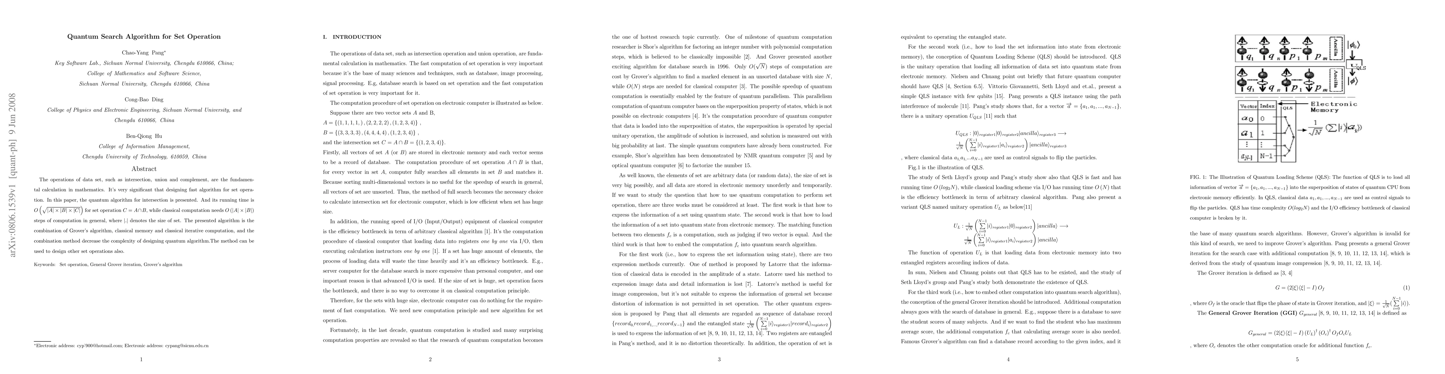 A quantum algorithm has been developed that performs set operations, such as intersection, with an improved time complexity of sqrt(|A|*|B|), compared to classical methods which require O(|A| * |B|) steps.