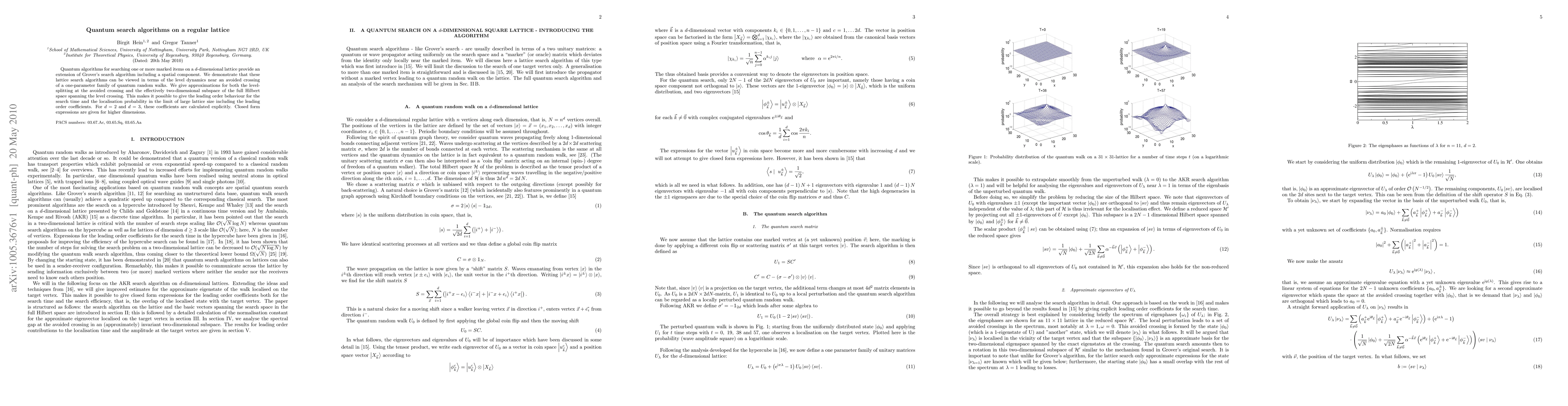This paper explores quantum search algorithms on d-dimensional lattices, extending Grover's algorithm with spatial dynamics. It connects these algorithms to level dynamics near avoided crossings in quantum random walks, providing approximations for search time and localization probability, with explicit calculations for d=2 and d=3 and closed form expressions for higher dimensions.