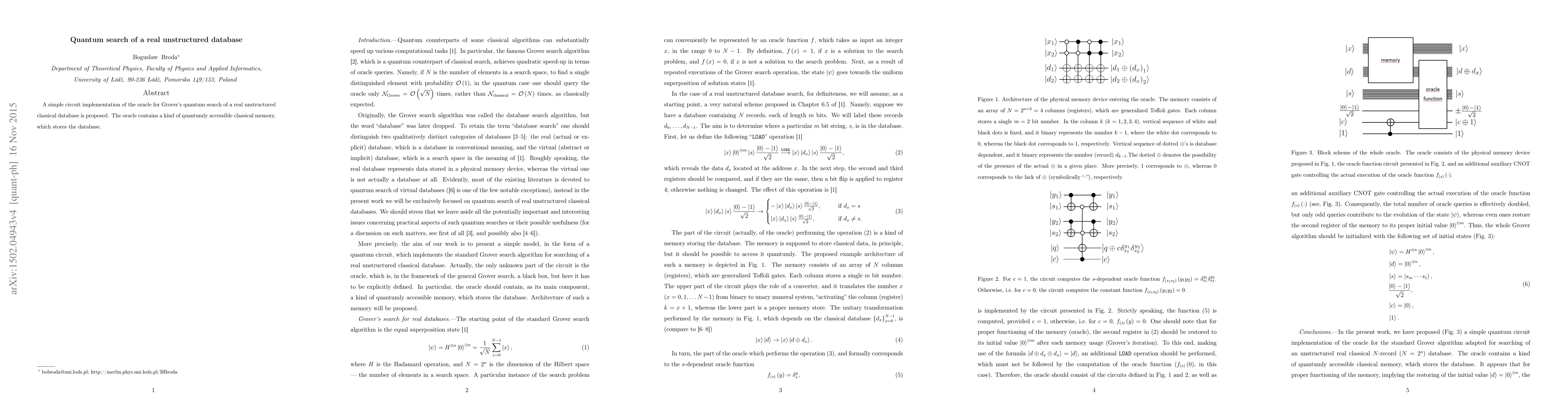 Summary: This paper proposes a quantum circuit implementation for Grover's search algorithm applied to a real unstructured classical database, utilizing quantumly accessible classical memory to store the database. The approach aims to enhance the efficiency of quantum search operations.