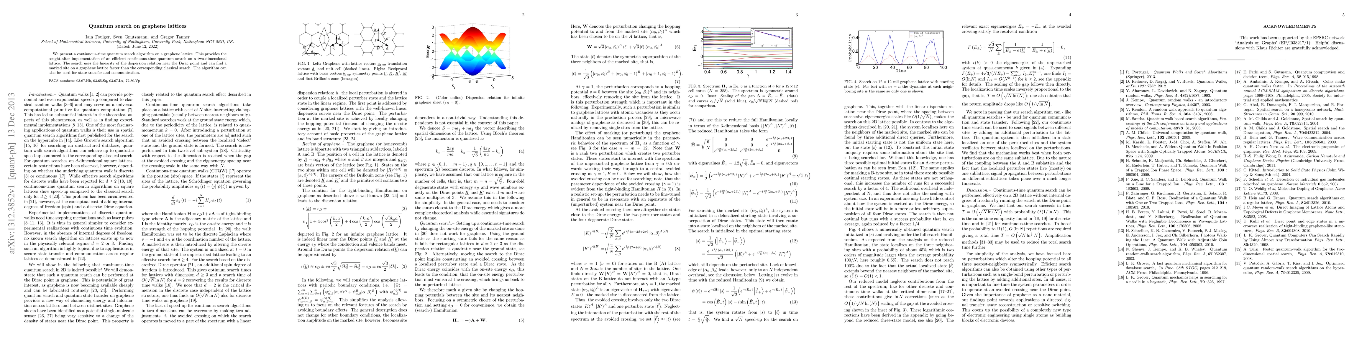 We present a continuous-time quantum search algorithm on a graphene lattice. This provides the sought-after implementation of an efficient continuous-time quantum search on a two-dimensional lattice. The search uses the linearity of the dispersion relation near the Dirac point and can find a marked site on a graphene lattice faster than the corresponding classical search. The algorithm can also be used for state transfer and communication.