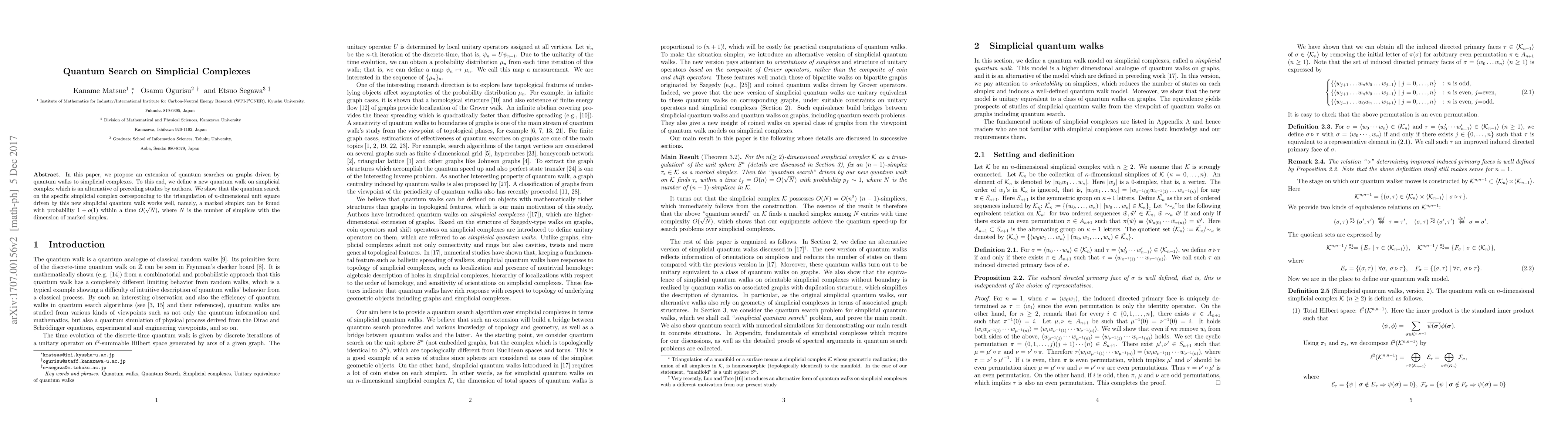 This paper introduces a novel quantum walk on simplicial complexes, extending quantum search methods from graphs. It demonstrates that this new approach enables efficient quantum search on a specific simplicial complex, achieving a marked simplex with high probability in $O(\sqrt{N})$ time, where $N$ is the number of simplices.