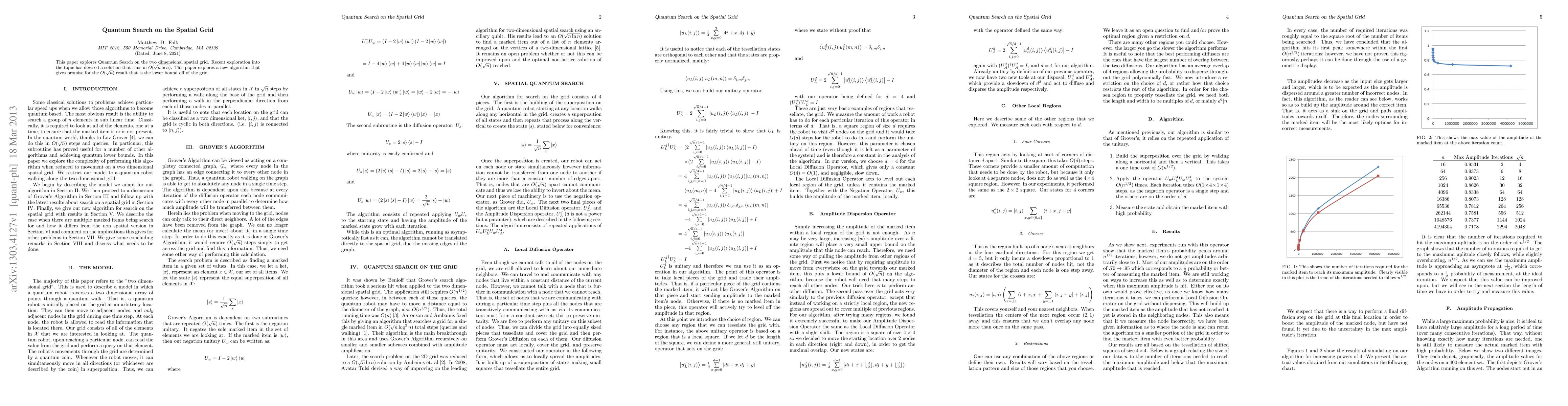 This paper explores Quantum Search on the two dimensional spatial grid. Recent exploration into the topic has devised a solution that runs in O(sqrt(n*ln(n))). This paper explores a new algorithm that gives promise for the O(sqrt(n)) result that is the lower bound off of the grid.