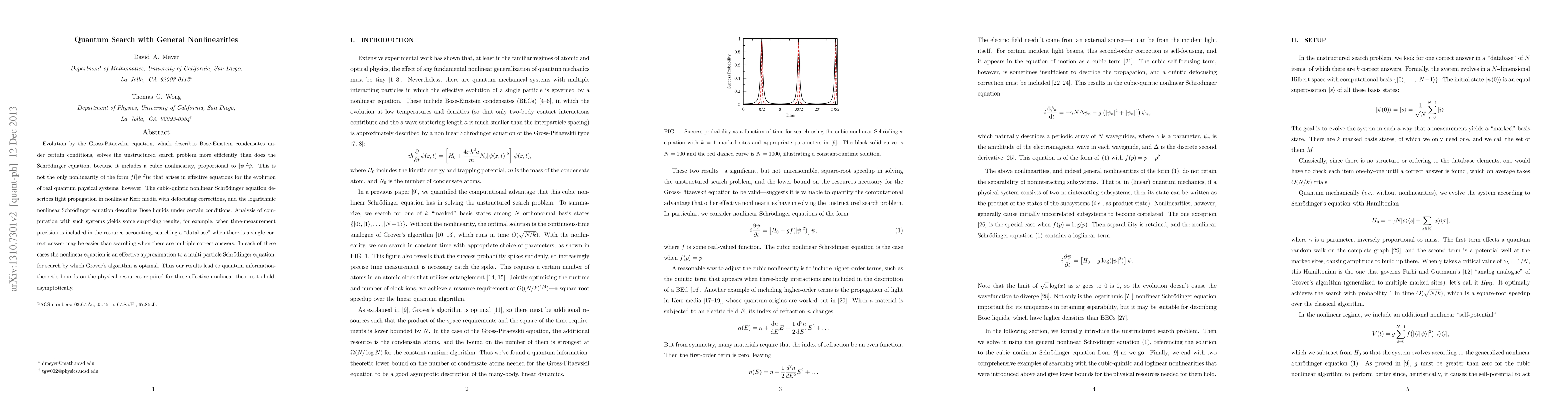 Evolution by the Gross-Pitaevskii equation, which describes Bose-Einstein condensates under certain conditions, solves the unstructured search problem more efficiently than does the Schr\"odinger equation, because it includes a cubic nonlinearity, proportional to $|\psi|^2\psi$. This is not the only nonlinearity of the form $f(|\psi|^2)\psi$ that arises in effective equations for the evolution of real quantum physical systems, however: The cubic-quintic nonlinear Schr\"odinger equation describes light propagation in nonlinear Kerr media with defocusing corrections, and the logarithmic nonlinear Schr\"odinger equation describes Bose liquids under certain conditions. Analysis of computation with such systems yields some surprising results; for example, when time-measurement precision is included in the resource accounting, searching a "database" when there is a single correct answer may be easier than searching when there are multiple correct answers. In each of these cases the nonlinear equation is an effective approximation to a multi-particle Schr\"odinger equation, for search by which Grover's algorithm is optimal. Thus our results lead to quantum information-theoretic bounds on the physical resources required for these effective nonlinear theories to hold, asymptotically.